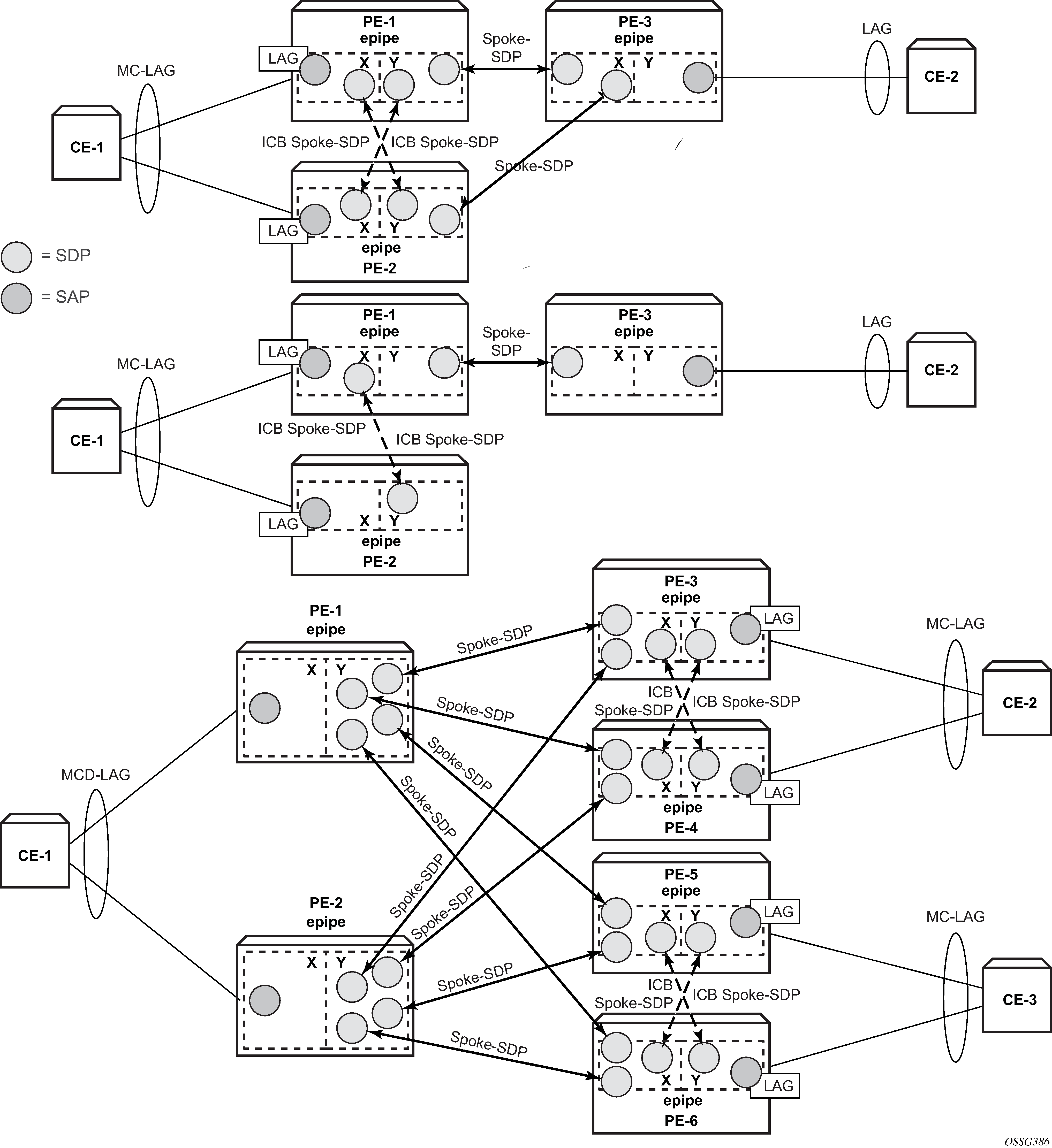 Two ICB spoke SDPs must be configured in the Epipe service on each PE router, one in each endpoint. Different SDP IDs can be used for the ICBs (as opposed to the regular pseudowires), but this is not necessary, because the far-end will be the same. The vc-id must be different however.
