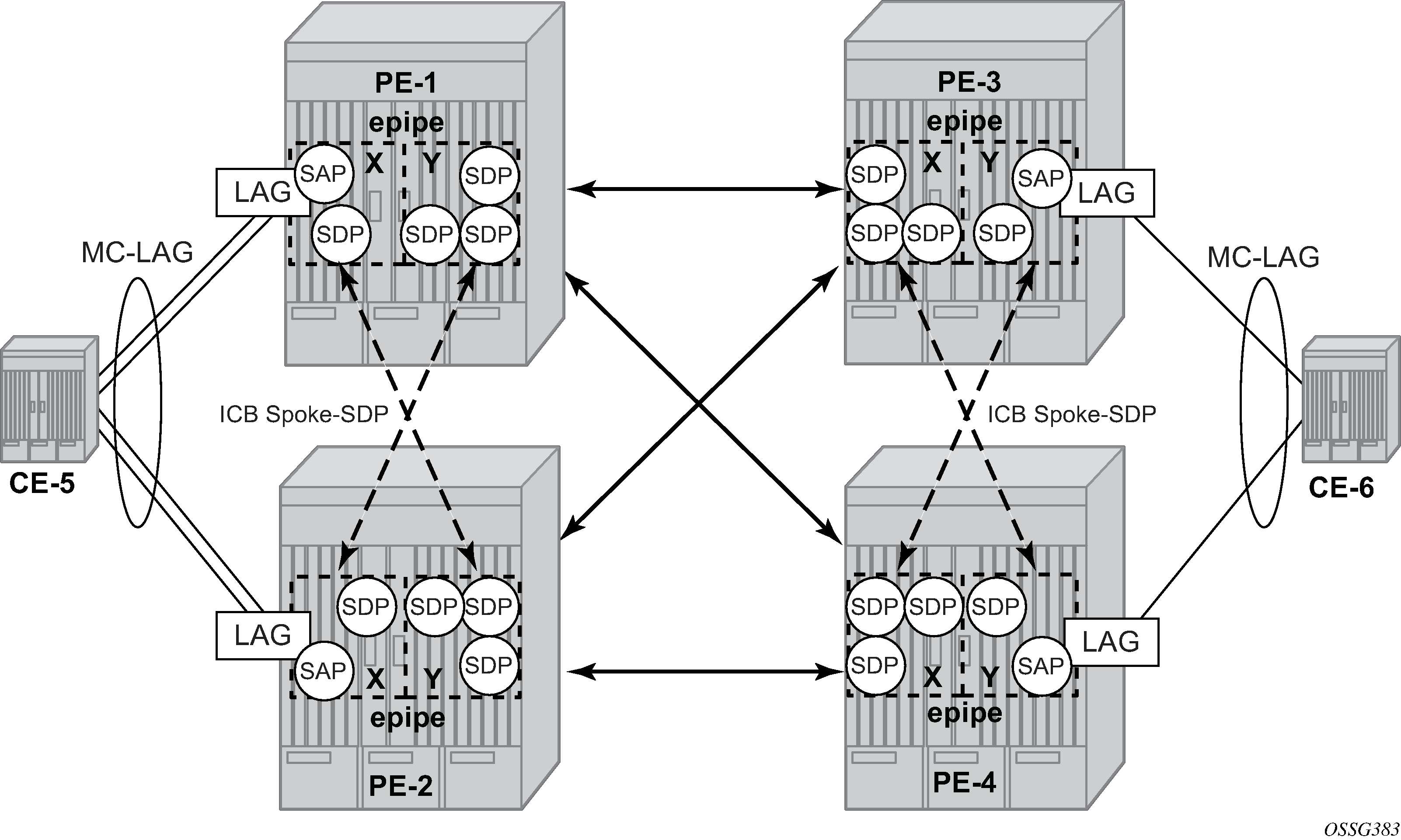 The ICB spoke SDPs must cross, one end should be associated with endpoint X and the other end (on the other PE) should be associated with endpoint Y. After configuring the ICB spoke SDPs, the Epipe service will be up/up on all four PE routers.