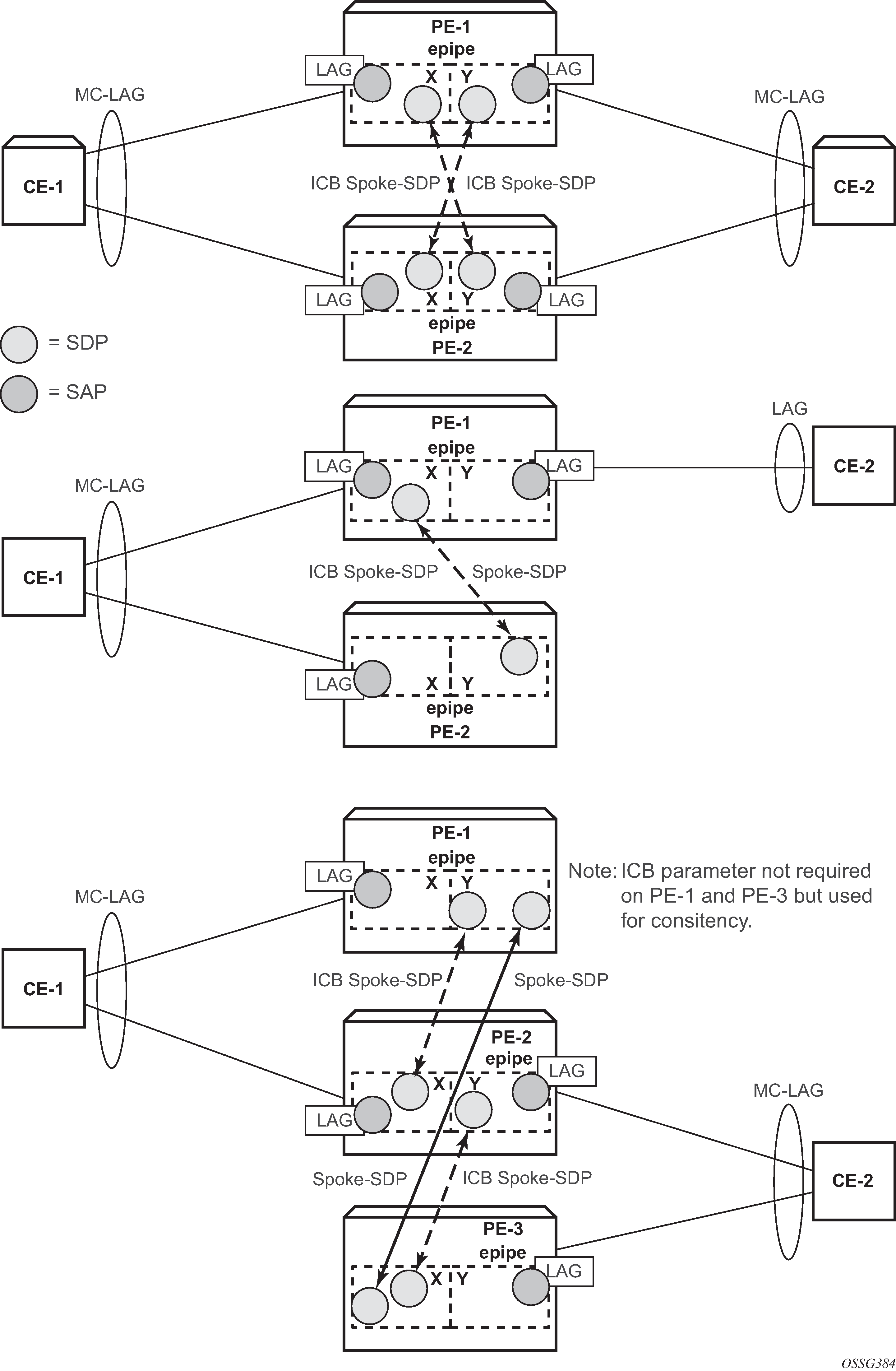 In this setup, the configuration of ICBs is optional. It can be used to speed up convergence by forwarding in-flight packets during MC-LAG transition. Additional setup example 1 shows some setup examples where ICBs are required. ICBs cannot be configured at endpoints where the other object is a standard SAP, only MC-LAG SAPs and pseudowires are allowed with ICBs.