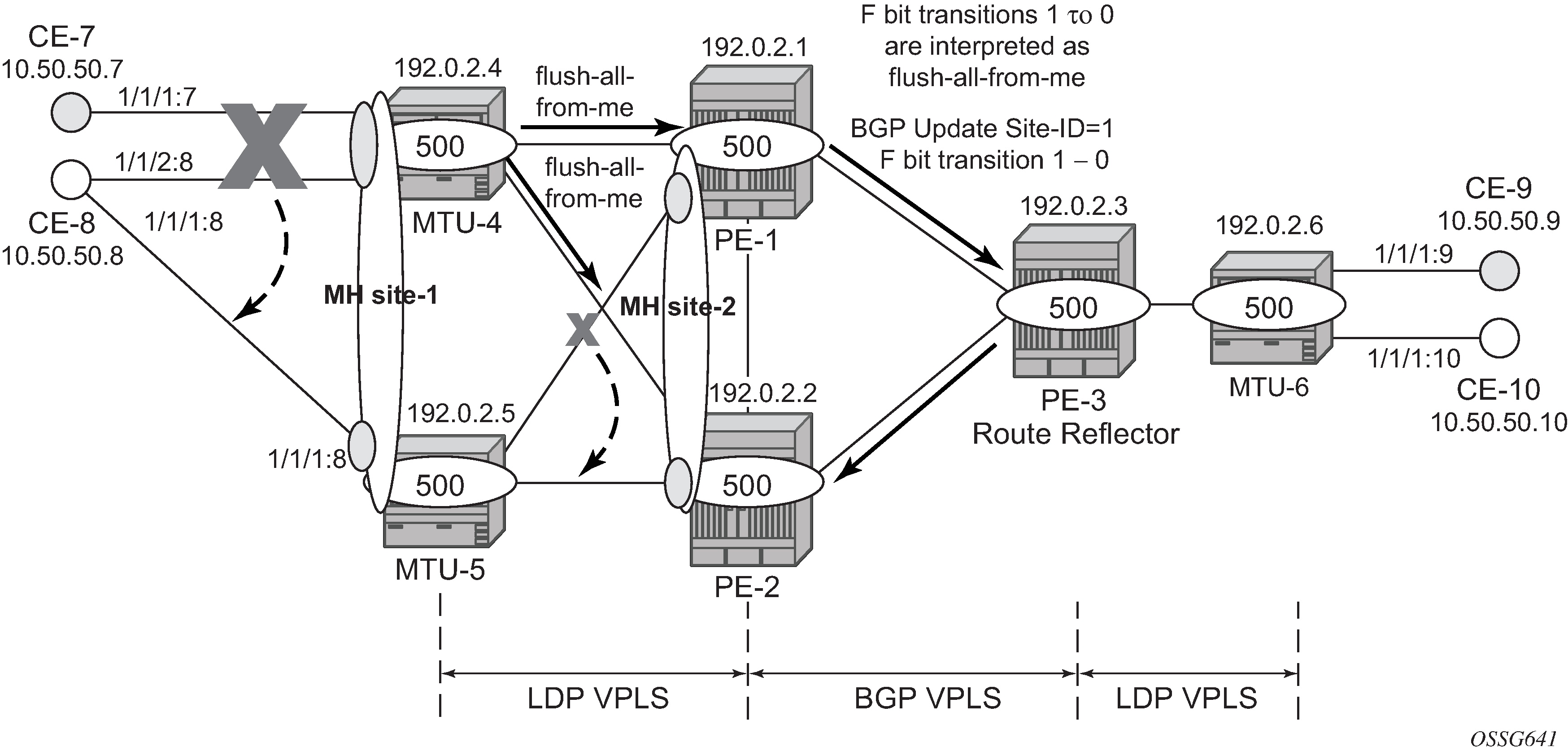 SR OS supports the use of Border Gateway Protocol Multi-Homing for VPLS (hereafter called BGP-MH). BGP-MH is described in draft-ietf-bess-vpls-multihoming, BGP based Multi-homing in Virtual Private LAN Service, and provides a network-based resiliency mechanism (no interaction from the Provider Edge routers (PEs) to Multi-Tenant Units/Customer Equipment (MTU/CE)) that can be applied on service access points (SAPs) or network (pseudowires) topologies. The BGP-MH procedures will run between the PEs and will provide a loop-free topology from the network perspective (only one logical active path will be provided per VPLS among all the objects SAPs or pseudowires which are part of the same Multi-Homing site).