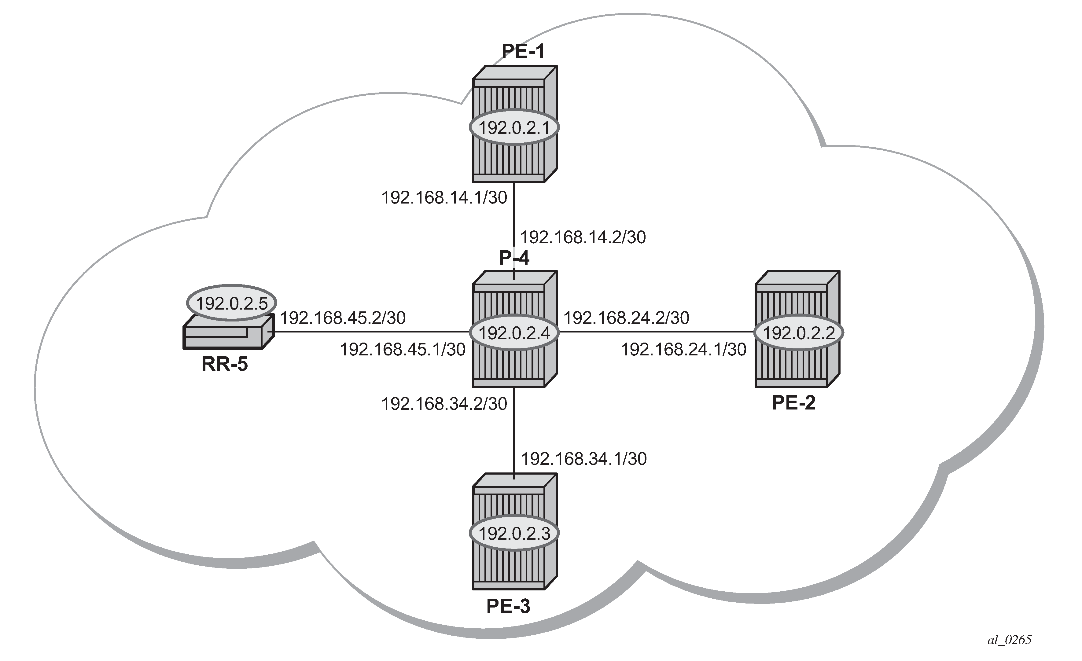 MPLS is configured on all interfaces between PE routers and P routers. It is not required between P-4 and RR-5.