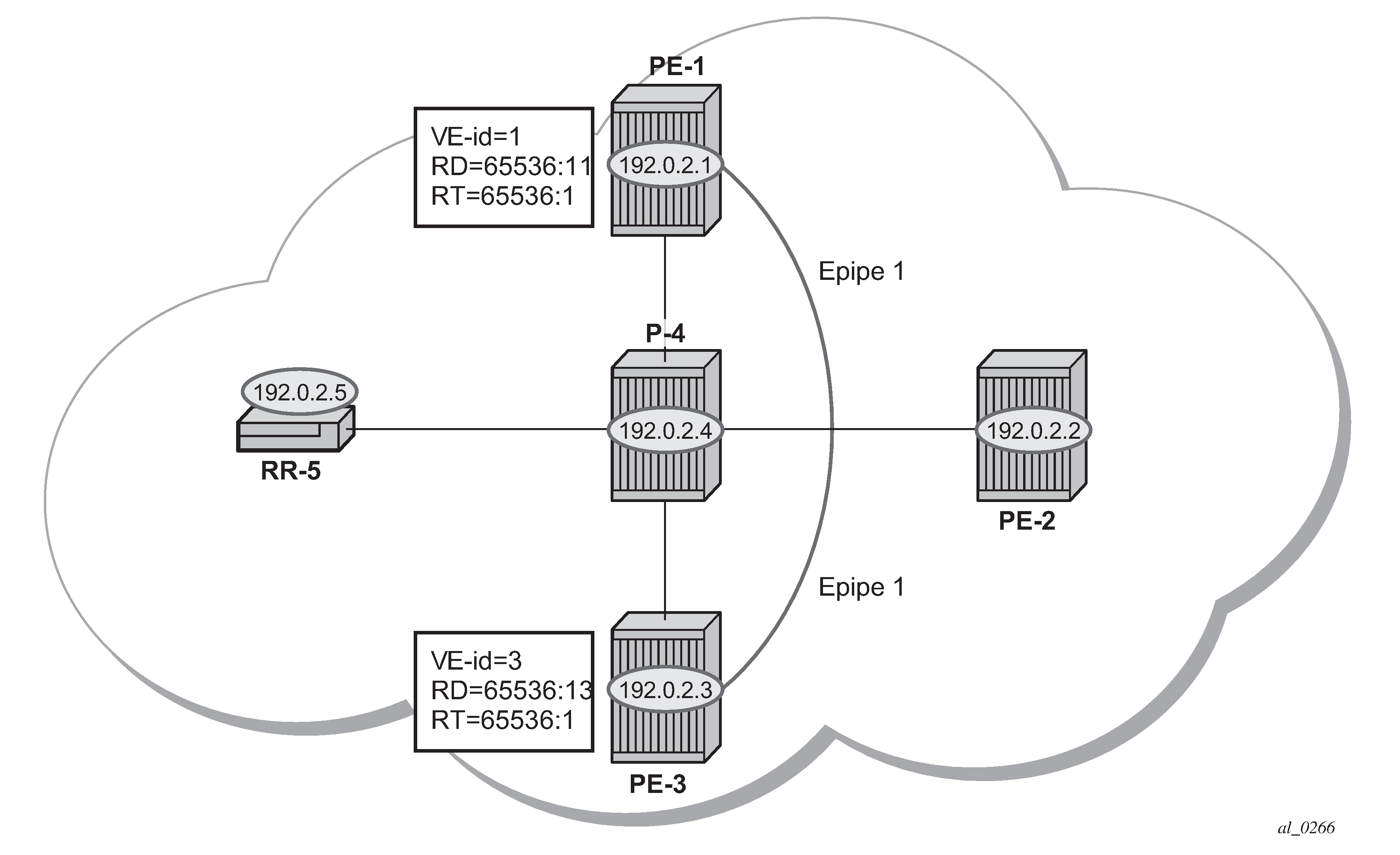 Each PE will advertise, via the RR, the presence of its BGP VPWS instance to all other PEs, along with a block of multiplexer labels (for BGP VPWS, one label per block) that can be used to communicate between each instance, plus a BGP next-hop that determines a labeled transport tunnel to be used between PEs.