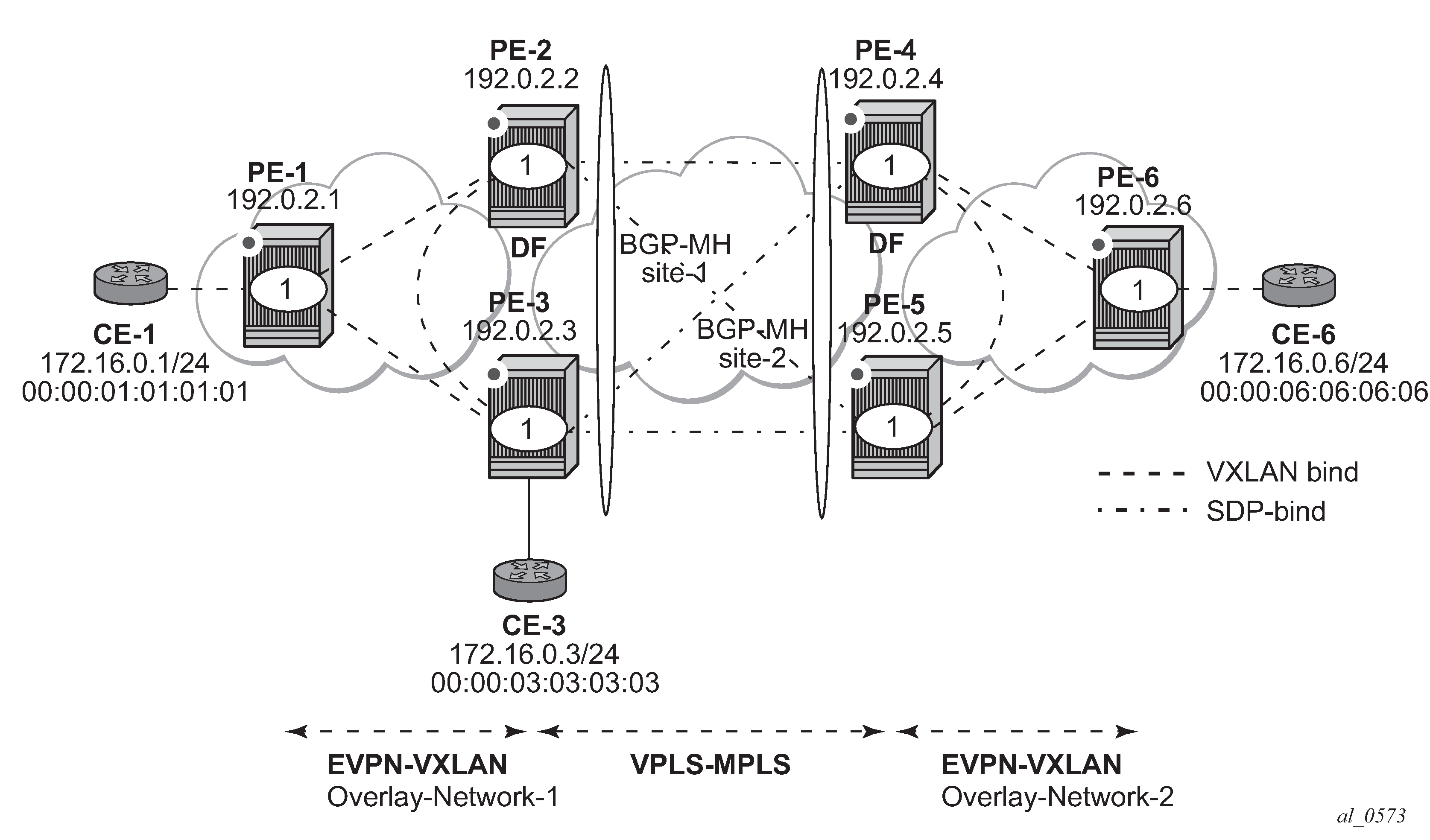 The example topology can illustrate a Data Center Interconnect (DCI) example, where Overlay-Network-1 and Overlay-Network-2 are two data centers interconnected through an MPLS WAN. In this application, CE-1, CE-3, and CE-6 simulate virtual machines or appliances, PE-2/3/4/5 act as DC GWs and PE-1/6 as NVEs (or virtual PEs running on compute infrastructure).