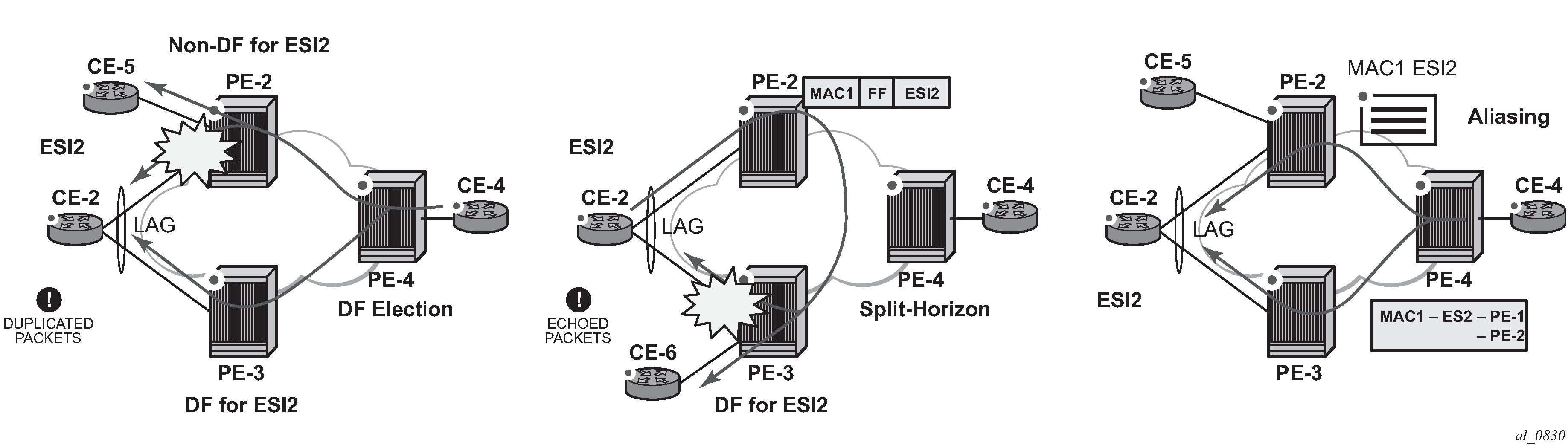 Route type 1 - Auto-discovery per Ethernet segment (AD per ES) route: This route is advertised per ES from the PE, carries the Ethernet Segment Identifier (ESI) label (used for split-horizon) in multi-homing mode, and can affect procedures such as the Designated Forwarder (DF) election, as well as the aliasing/backup path/mass withdrawal on remote PEs.