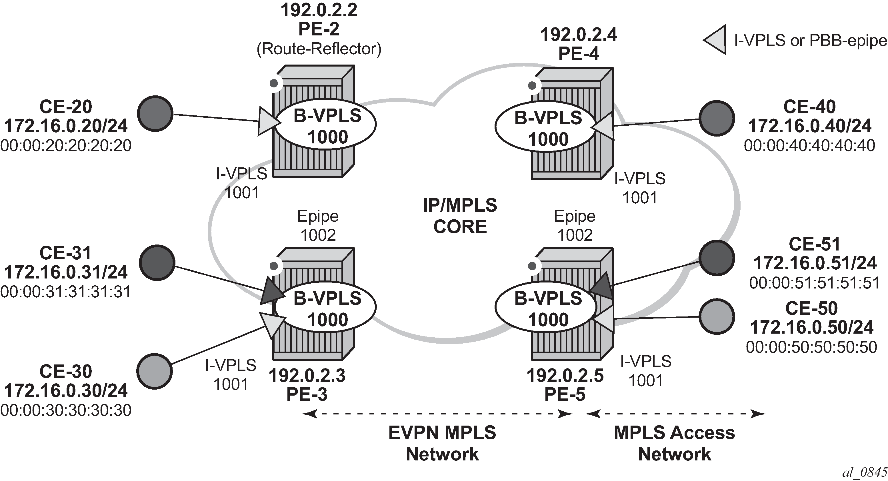 EVPN for Provider Backbone Bridging (PBB) over MPLS (hereafter called PBB-EVPN) is specified in RFC 7623, Provider Backbone Bridging Combined with Ethernet VPN (PBB-EVPN). It provides a simplified version of EVPN-MPLS for cases where the network requires very high scalability and does not need all the advanced features supported by EVPN-MPLS (but still requires single-active and all-active multi-homing capabilities). EVPN and PBB-EVPN SR OS feature comparison provides a comparison between the capabilities of EVPN and PBB-EVPN in SR OS, and may help to choose between them when designing a VPN service.