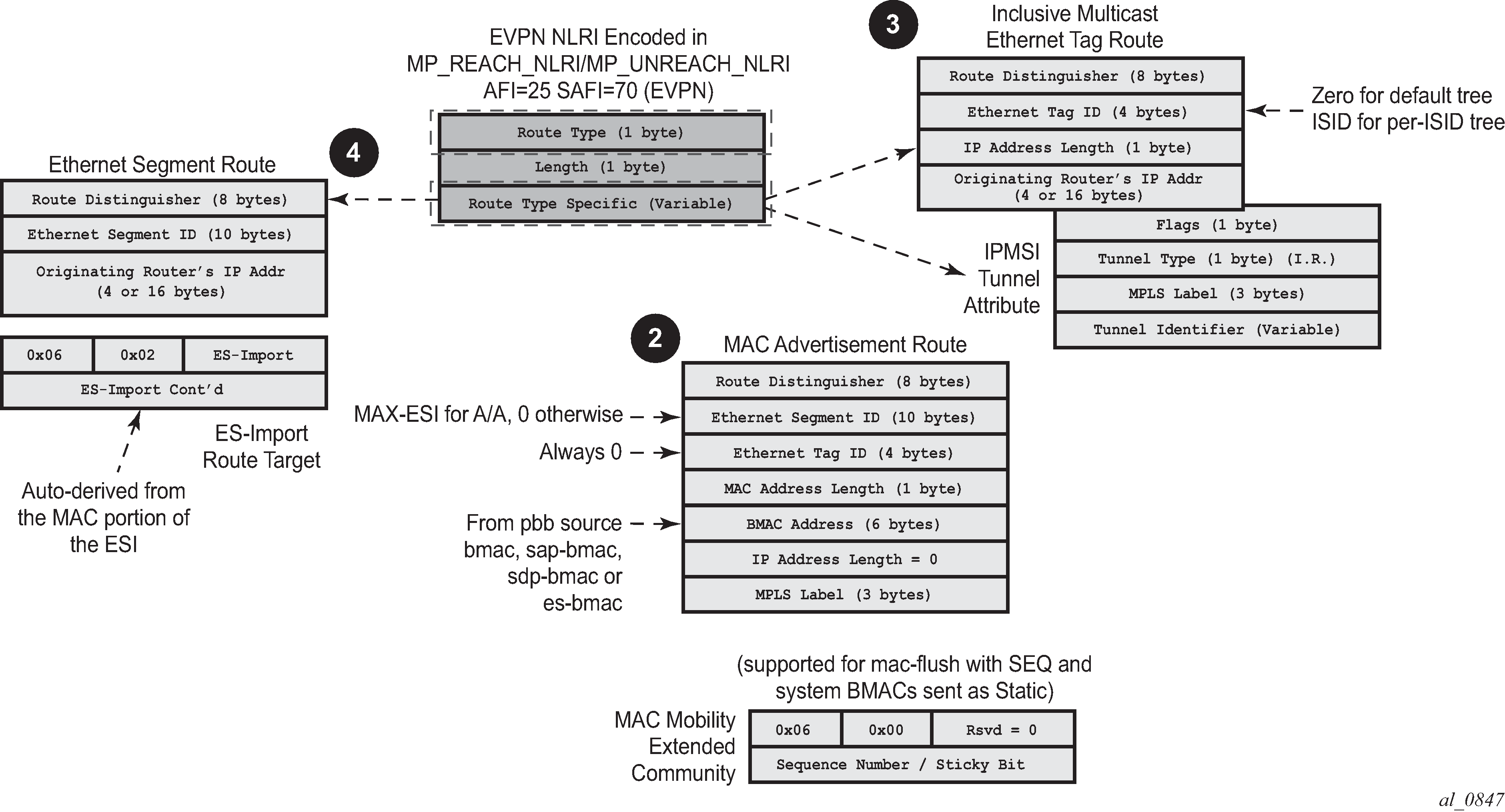 Route type 3 — Inclusive Multicast route — This route type is used for the advertisement of the I-VPLS ISIDs (no Epipes) and the desired multicast tree for each of them. The ISIDs are encoded in the Ethernet-tag field of the Network Layer Reachability Information (NLRI). When the B-VPLS is created and enabled, an Inclusive Multicast route with ISID = 0 is advertised. This is for the creation of the default multicast tree.