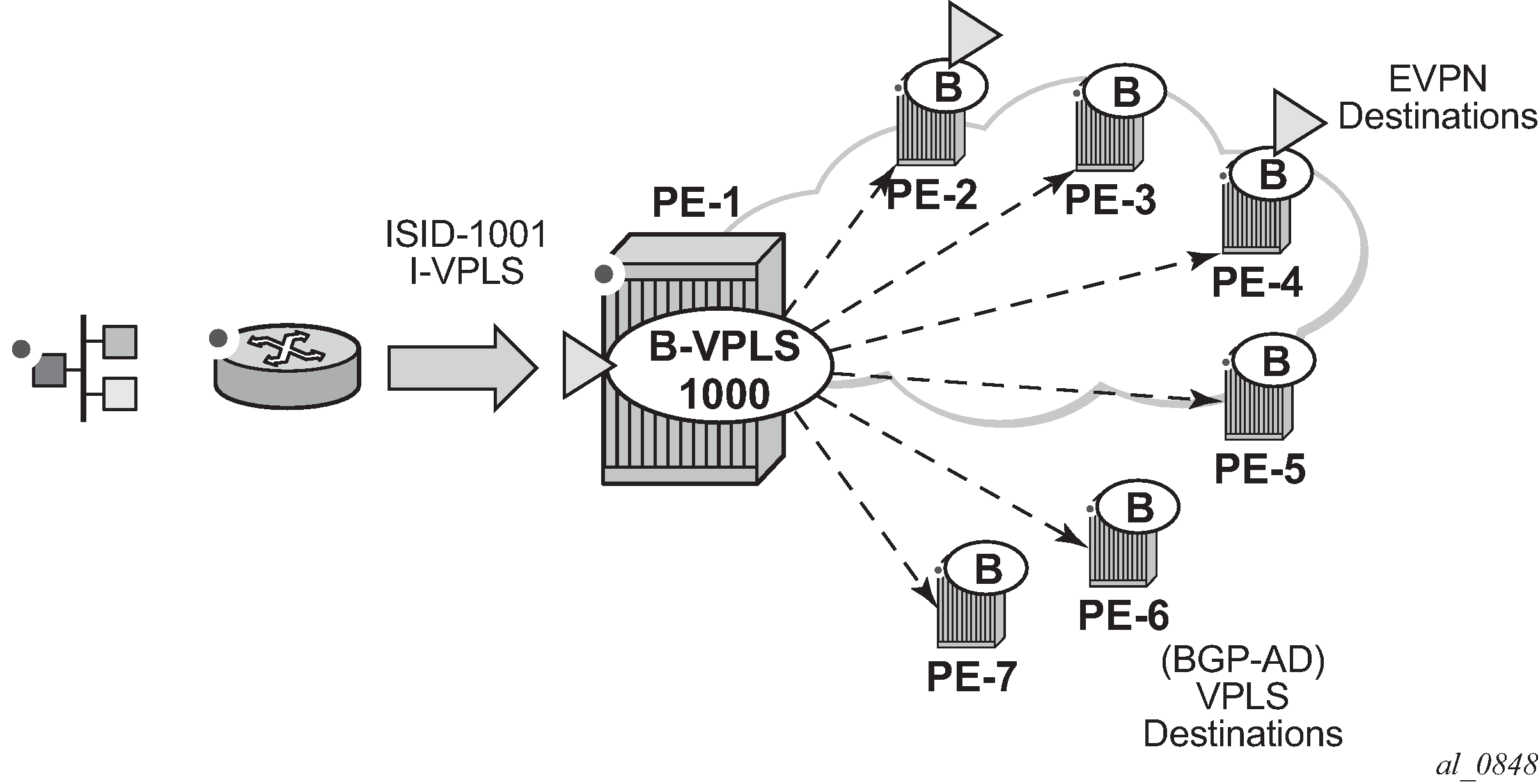 There is no difference at the access side (I-VPLS and Epipe configuration) compared to other PBB technologies supported in SR OS, such as Shortest Path Bridging for MAC (SPBM) or PBB-VPLS.