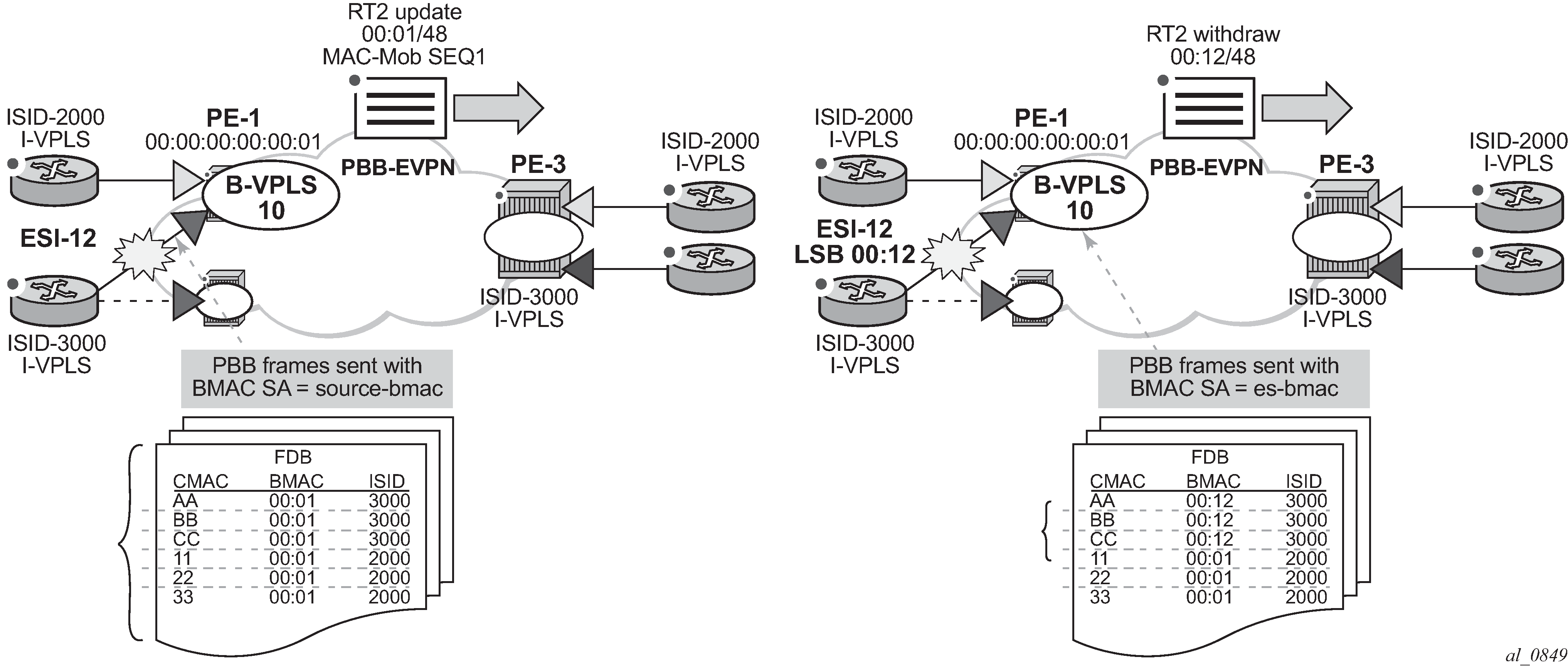 In the preceding example, the DF for ISID 1001 is PE-5. With a failure event on the SDP to MTU-6, PE-5 will not withdraw the advertised source BMAC (because it is still being used as source BMAC for other services and even CEs within the same service). PE-5 will send an update of the same source BMAC instead, increasing the sequence number in the MAC mobility extended community. That will be a flush-all-from-me indication for the remote PEs (they will flush all the CMACs associated with the updated source BMAC, regardless of the service).