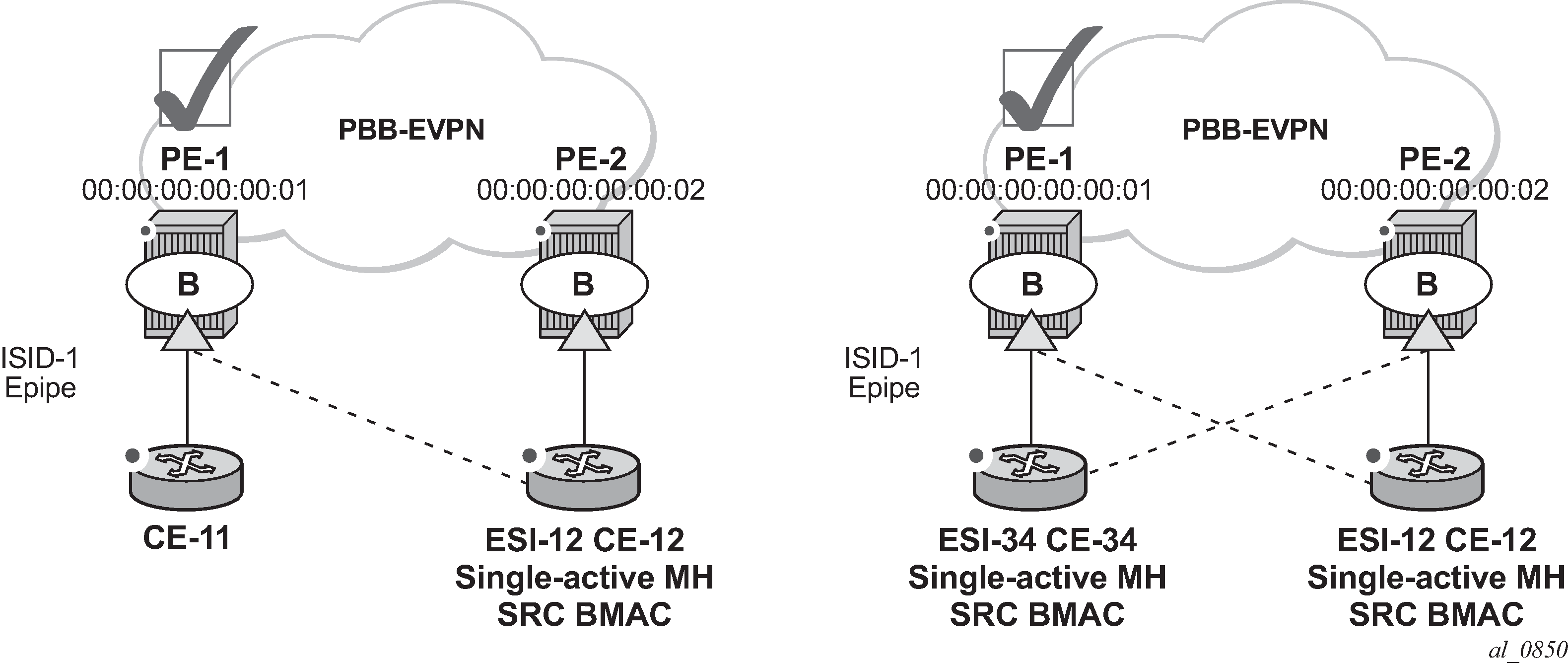 In the network in PBB-EVPN multi-homing, Epipes can only support single-homing or all-active multi-homing but not single-active. For non-local-switching PBB-Epipes (there is a single SAP per Epipe), only all-active multi-homing is supported. Single-active multi-homing for local-switching enabled PBB-Epipes (two SAPs are defined within the PBB-Epipe instance) is only supported in the following scenarios.