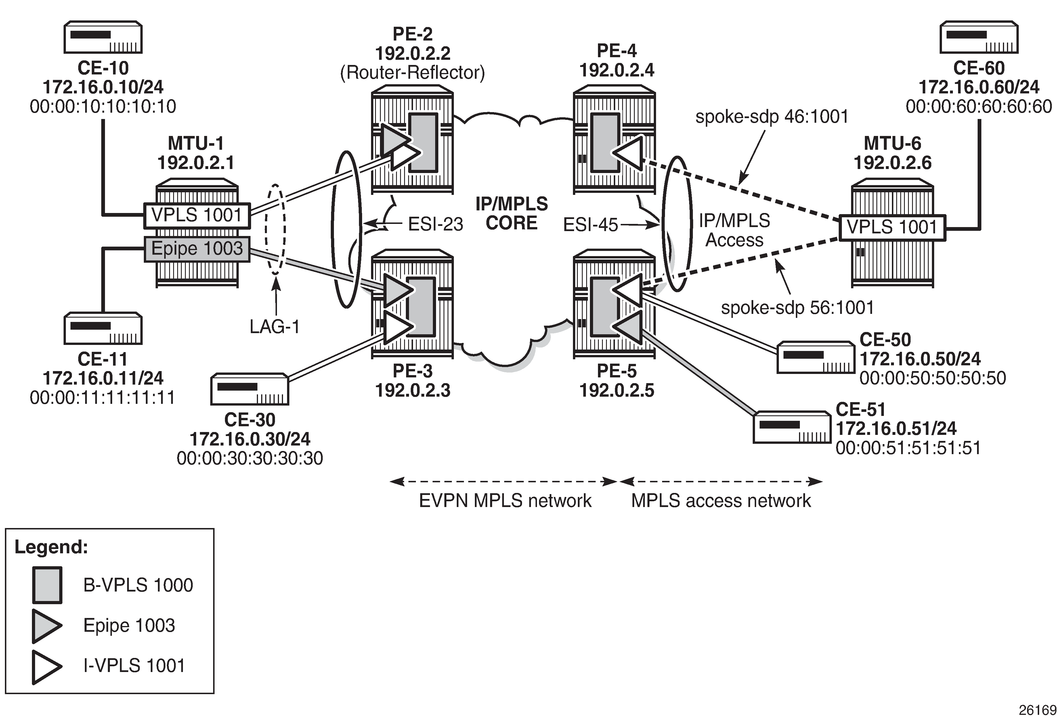 The PEs are interconnected in the same way as explained in EVPN for MPLS Tunnels with the same IP addressing, IS-IS, transport LDP, and BGP peering configuration. There is not any difference with the basic infrastructure. See the EVPN for MPLS Tunnels chapter if more information is required.