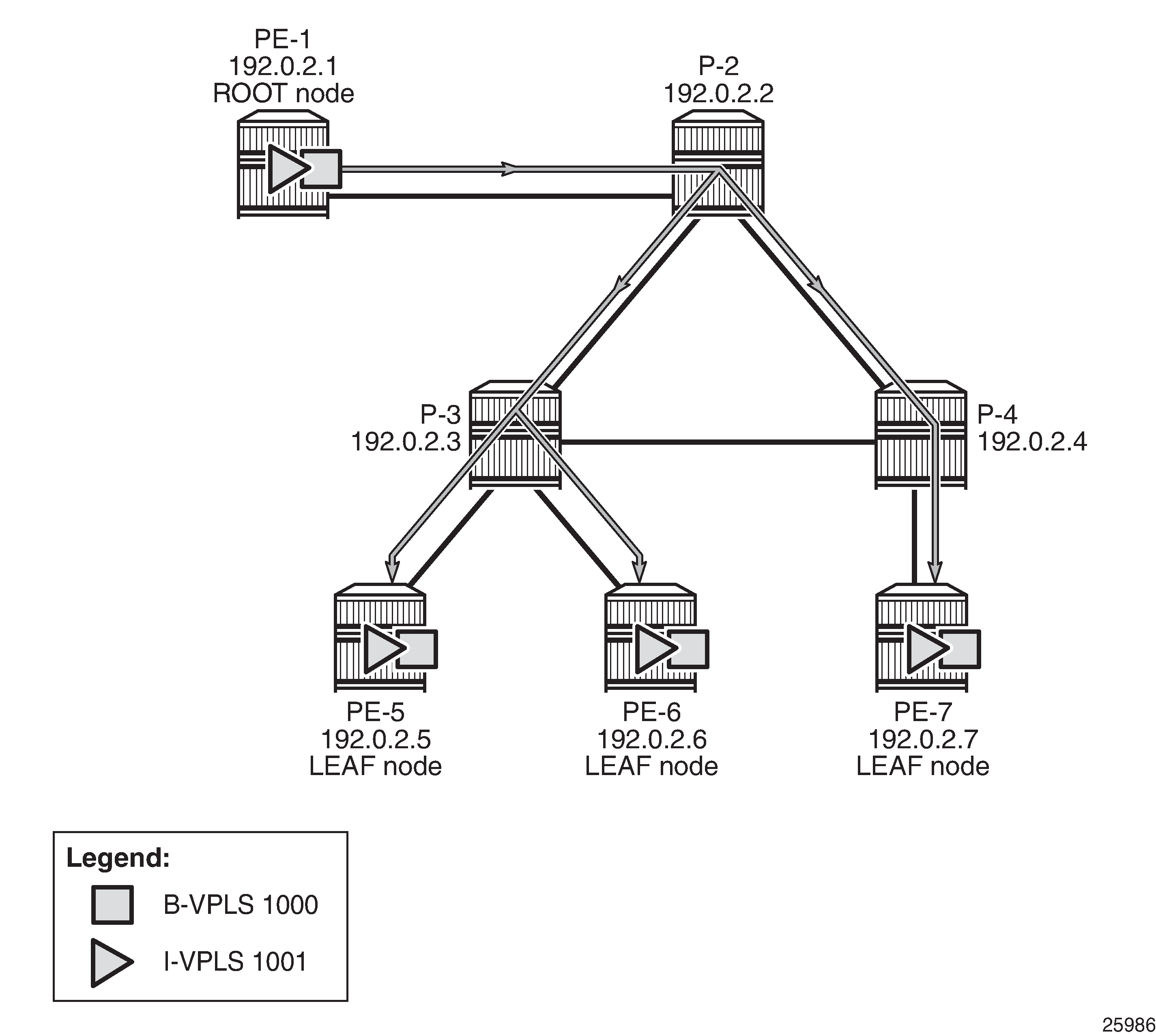 PE-1 is configured with root-and-leaf. The configuration for B-VPLS and I-VPLS is as follows: