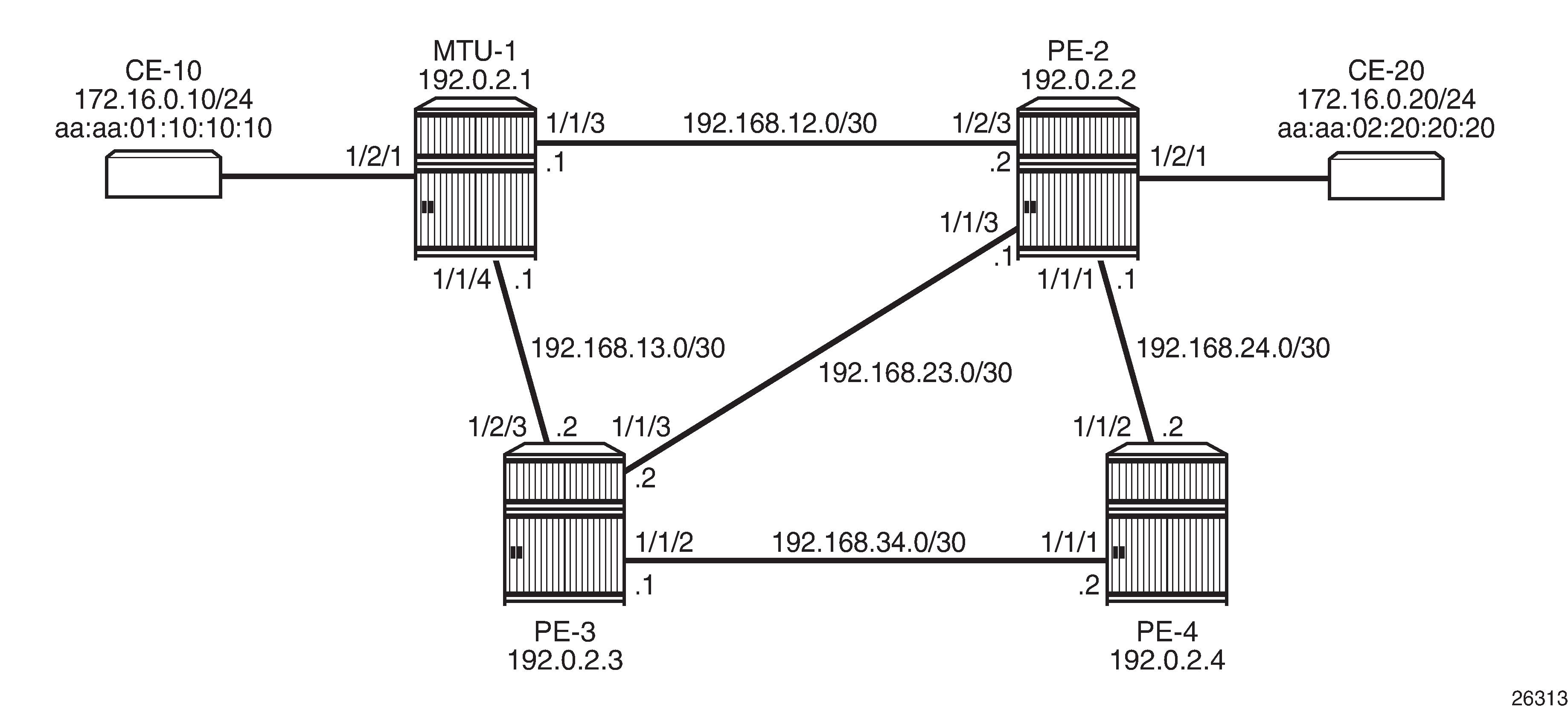 VPLS 1 is configured on all nodes. Initially, ALMP is disabled. On MTU-1, the VPLS 1 contains three SAPs: one toward CE-10, one toward PE-2, and one toward PE-3.