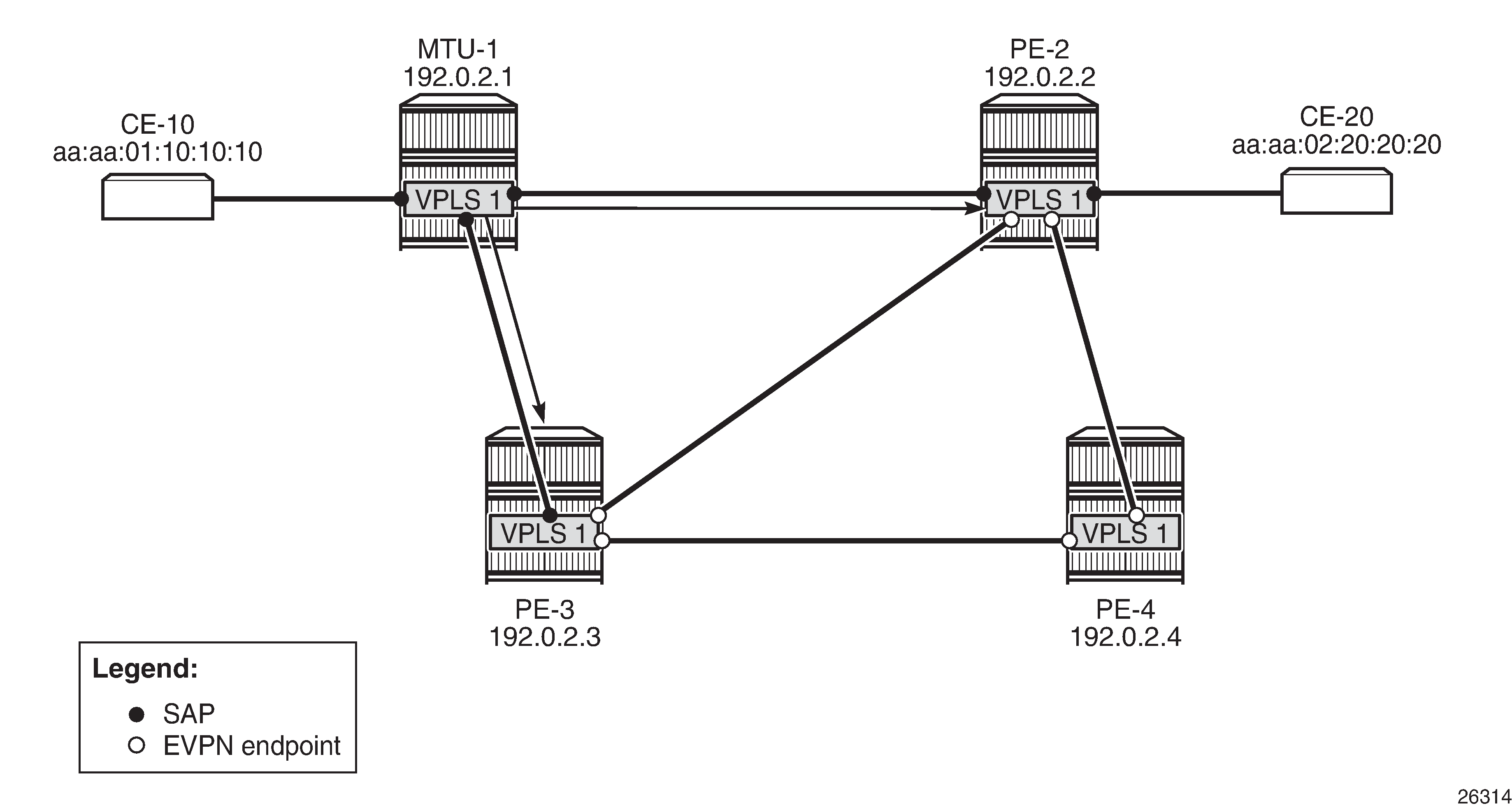 When traffic is sent from CE-10 to CE-20, MAC address aa:aa:01:10:10:10 of CE-10 is learned simultaneously on SAP 1/2/3:1 in PE-2 and PE-3 and protected on both SAPs. MAC address aa:aa:02:20:20:20 is, in this case, first learned via MAC address learning on PE-2 and advertised via a BGP EVPN MAC address route update. However, it might happen that it was learned and protected on the SAP on PE-3 first, before the MAC address was learned and protected on PE-2 and the BGP EVPN MAC address route update sent by PE-2 was received at PE-3. In the latter case, both MAC address aa:aa:01:10:10:10 and MAC address aa:aa:02:20:20:20 are learned and protected on the SAPs on both PE-2 and PE-3, and RPS-DF on the EVPN-MPLS destinations prevents loops.