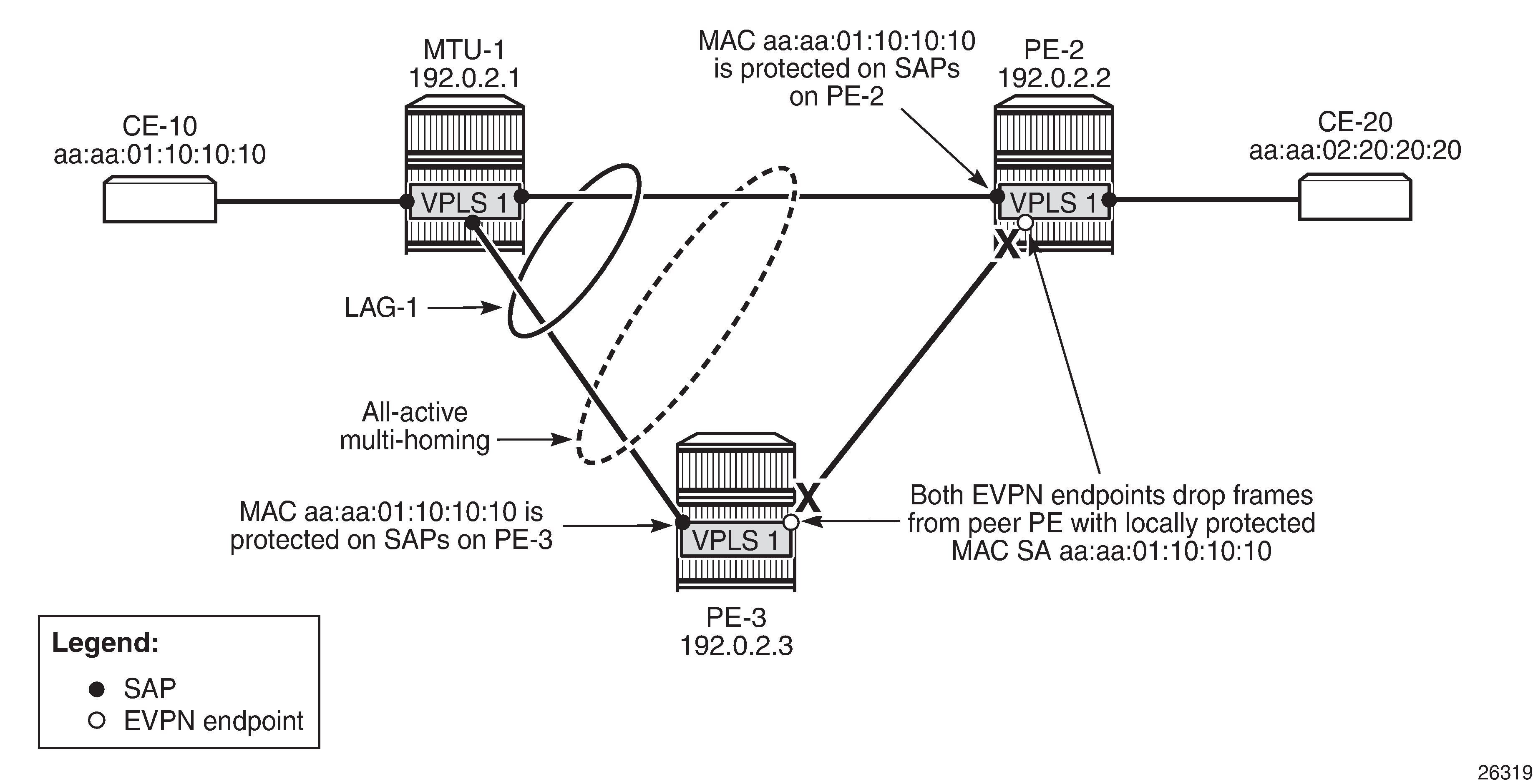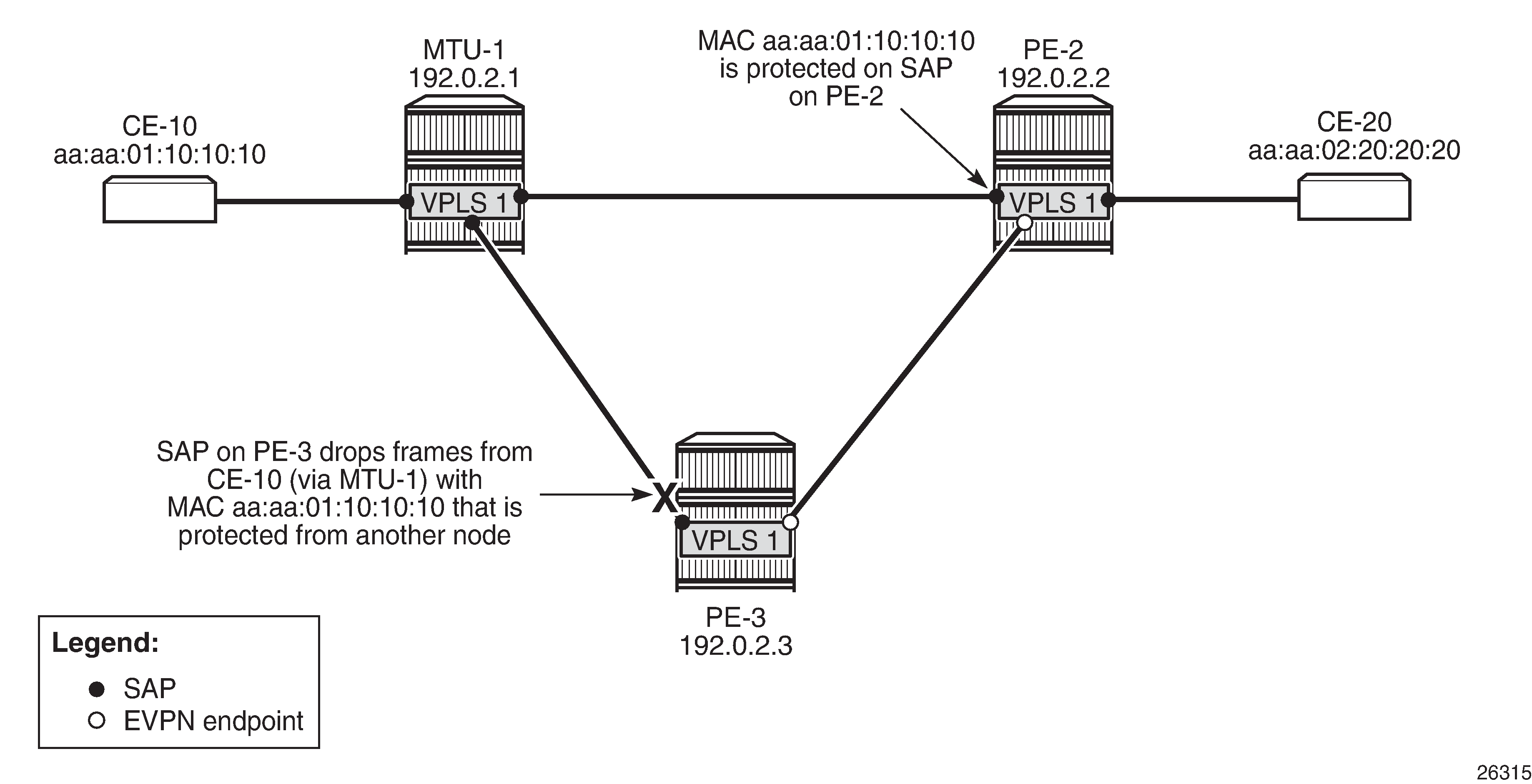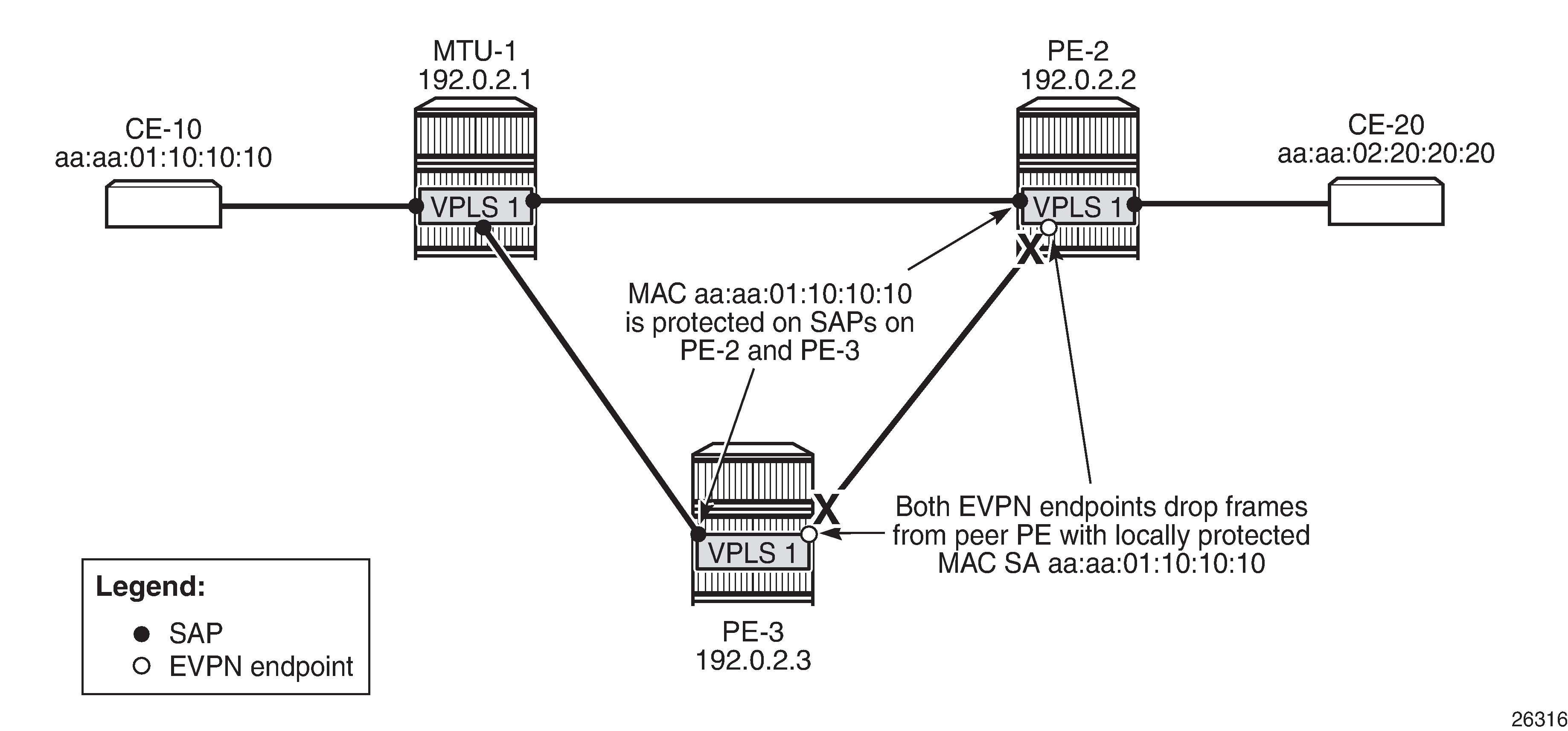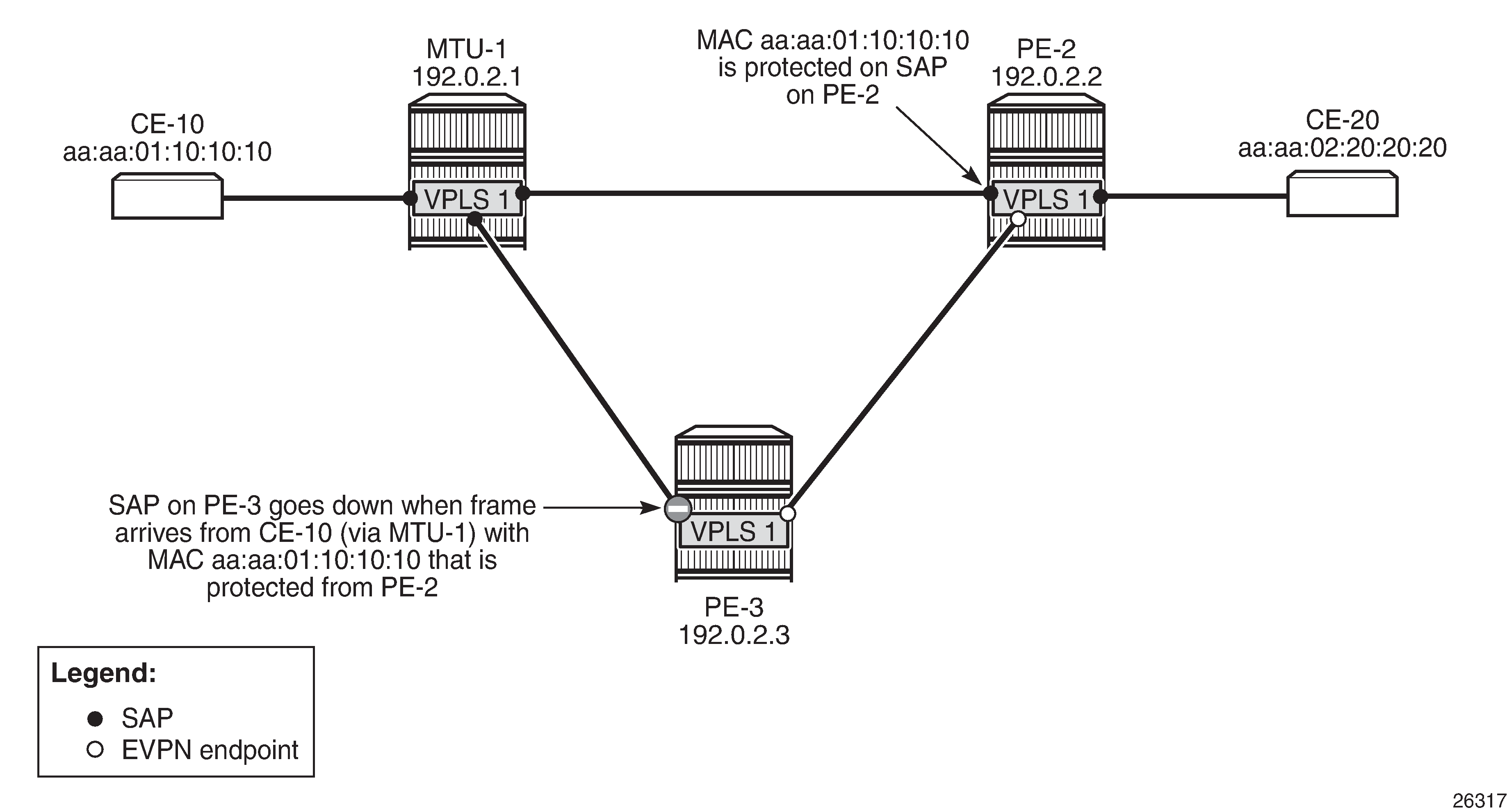 SAP 1/2/3:1 will not be brought down if frames are received with MAC address aa:aa:01:10:10:10 that is locally learned and protected. However, MAC address aa:aa:02:20:20:20 was learned and protected first on PE-2 and the BGP update was received by PE-3 before the MAC address was received on PE-3. Therefore, MAC address aa:aa:02:20:20:20 will not be learned and protected on PE-3 and, if frames with a MAC SA aa:aa:02:20:20:20 were received on SAP 1/2/3:1 on PE-3, the SAP would be brought down.