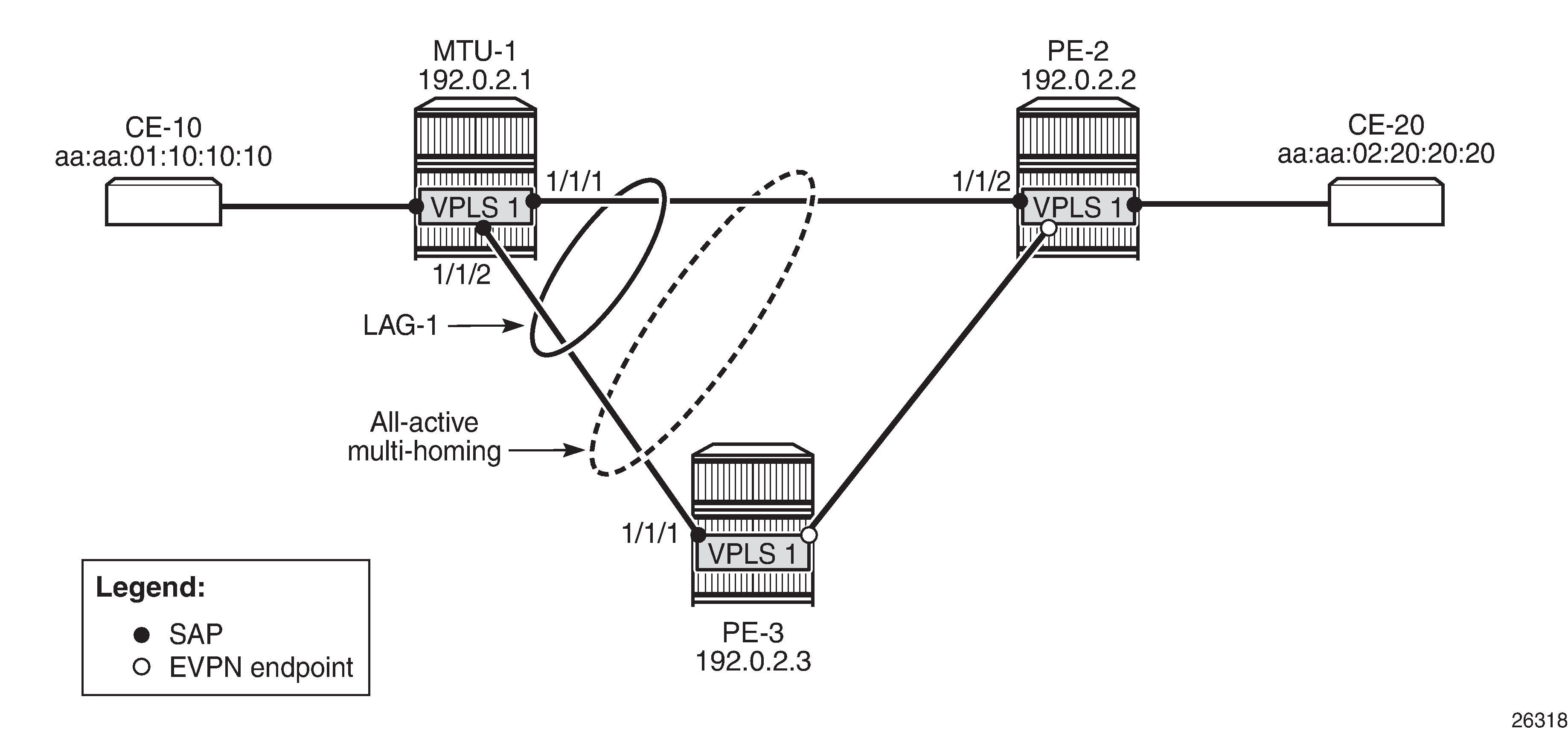 The traffic flows from CE-10 and CE-20 are hashed over both links in the LAG. When the frames are sent out on MTU-1 on port 1/1/1 toward PE-2, the traffic reaches CE-20, and traffic can be sent back from CE-20 to CE-10 via the direct link between PE-2 and MTU-1. However, when traffic is sent out from MTU-1 on port 1/1/2 toward PE-3, the frames will be forwarded from PE-3 to PE-2, where they will be discarded at the EVPN MPLS destination on PE-2 because of RPS-DF. No traffic flow is possible for frames with the protected MAC SA aa:aa:01:10:10:10 via PE-3 to PE-2, or vice versa. If the MAC address is not protected yet on PE-2, the first few messages get through until the MAC address is protected on PE-2. Both multi-homing PEs, PE-2 and PE-3, protect the MAC address aa:aa:01:10:10:10 on their local all-active SAP. Therefore, PE-2 discards all frames with the MAC SA aa:aa:01:10:10:10 when they are received on the EVPN MPLS destination from the other multi-homing PE (PE-3).