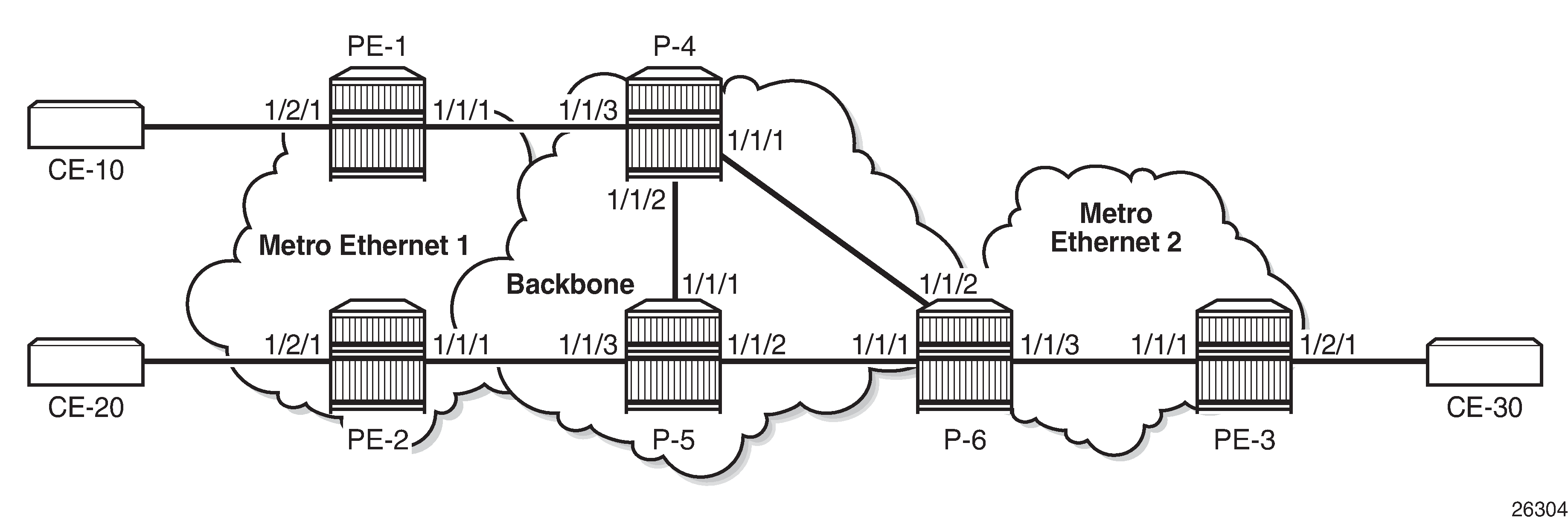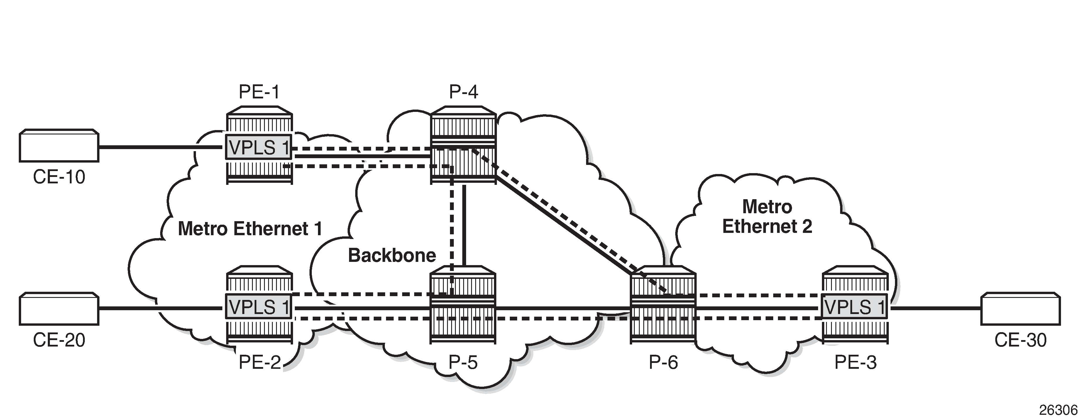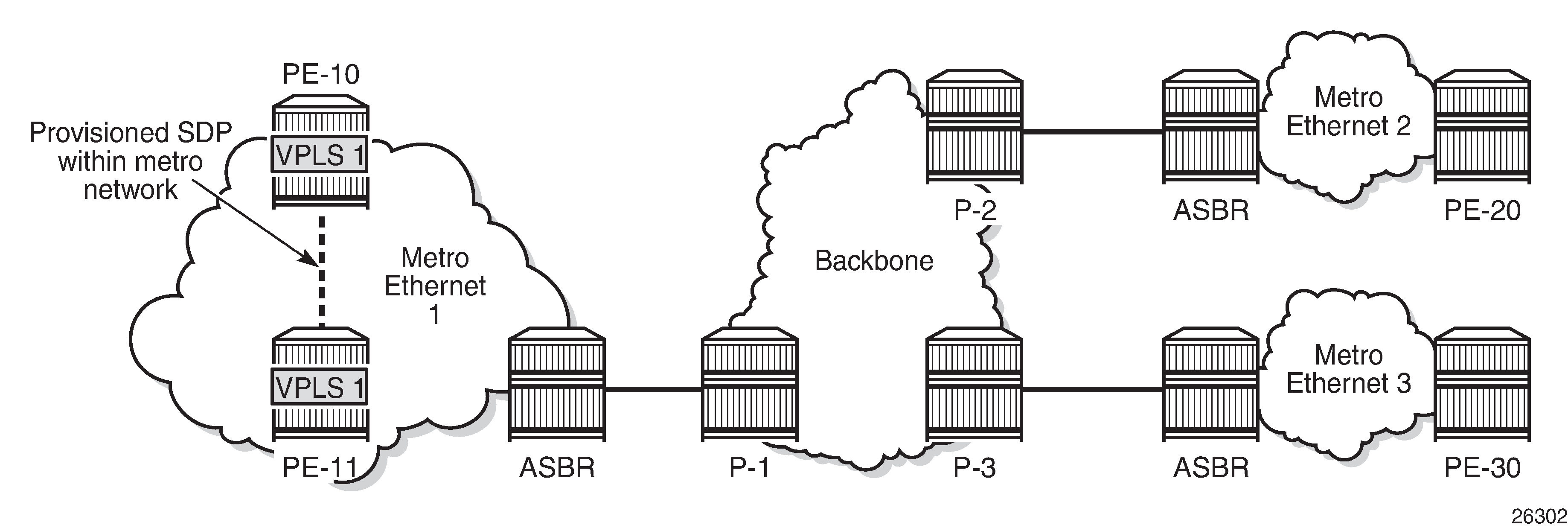 The service provider initially started with PE-10 and PE-11 in metro Ethernet 1, but now wants to add PE-20 and PE-30 as new sites to the VPLS service. Therefore, the BGP-AD routes should propagate beyond the boundaries of the metro Ethernet network. The backbone network may be in a different AS, but in this example, all networks are in the same AS. VPLS 1 of customer X can have sites added to the service on PEs in different metro Ethernet networks. A new PW template is created with the prefer-provisioned-sdp option and applied to the VPLS service.