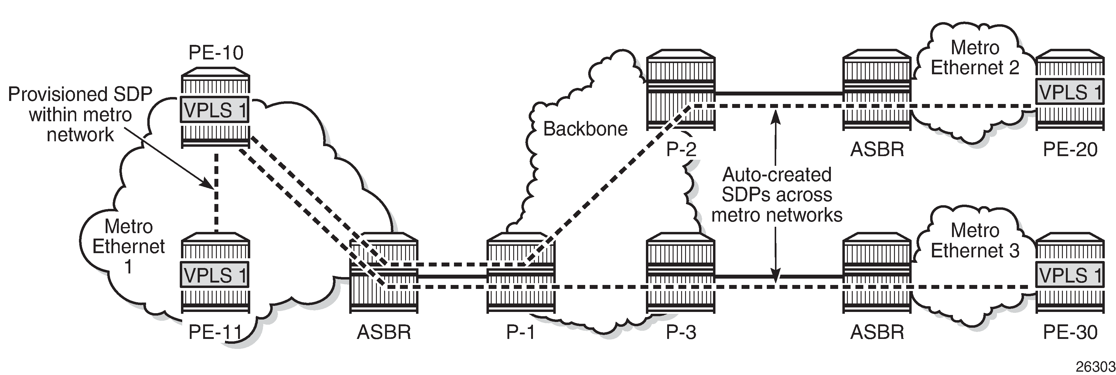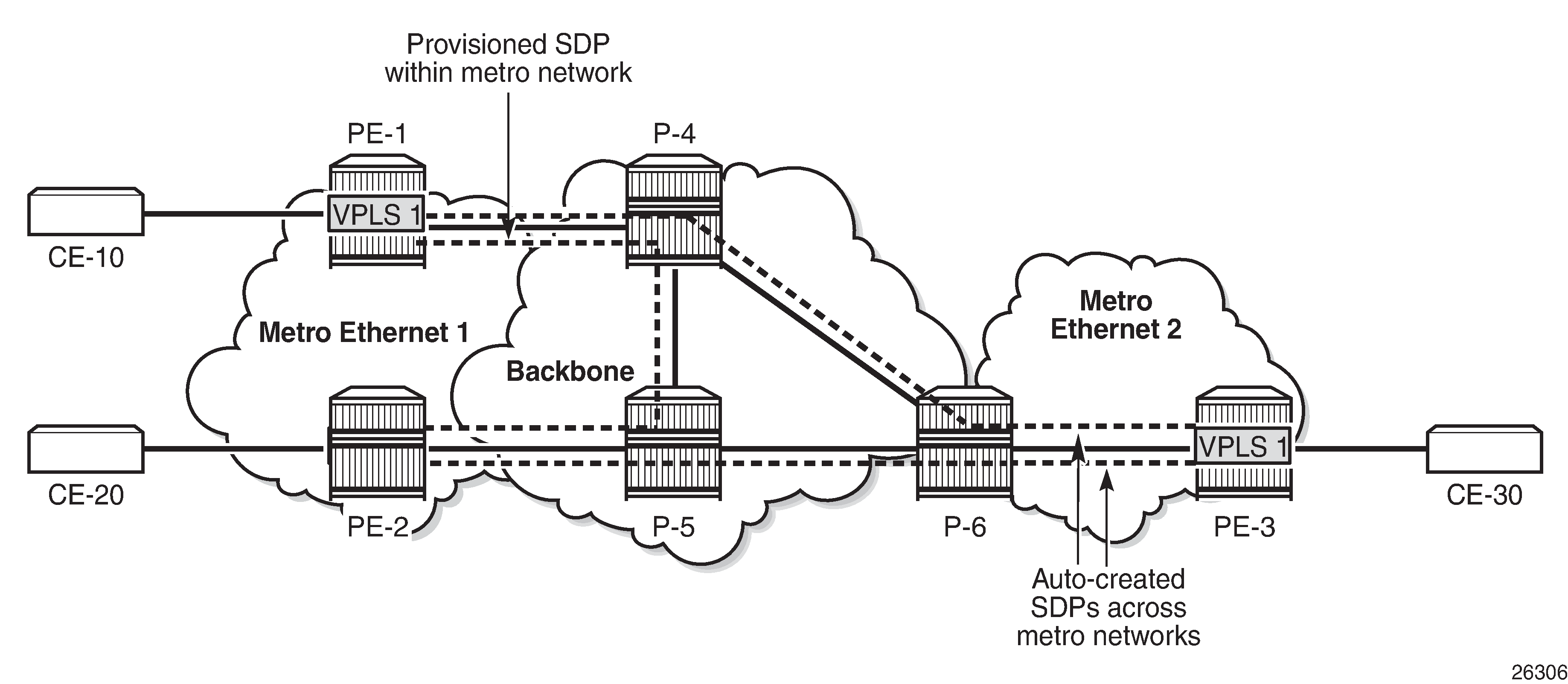 When a new site within the metro Ethernet network is added, an SDP is already provisioned to this site and this SDP is used for the SDP binding in the VPLS.
