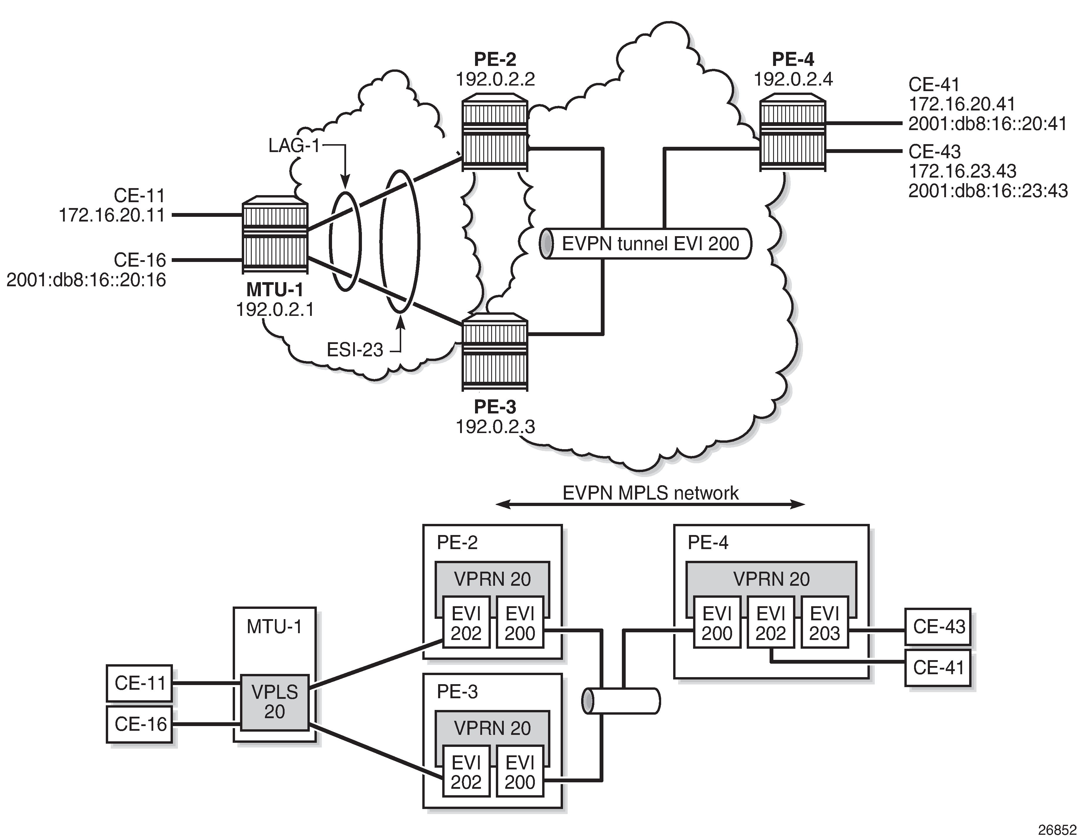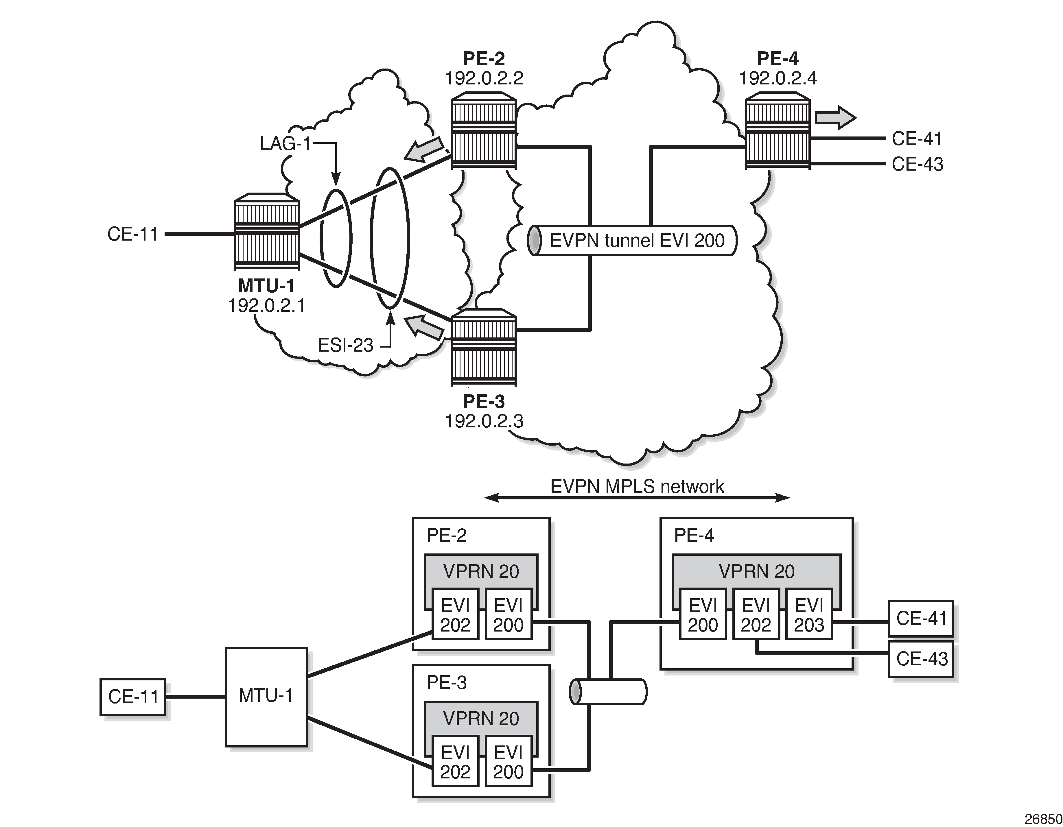 The configuration is similar on PE-3. It is important that the RD is different on PE-2 and PE-3, but it is automatically the case when the RD is auto-derived from the configured EVI, as in the example. The RD on PE-2 is 192.0.2.2:101; on PE-3, the RD is 192.0.2.3:101.