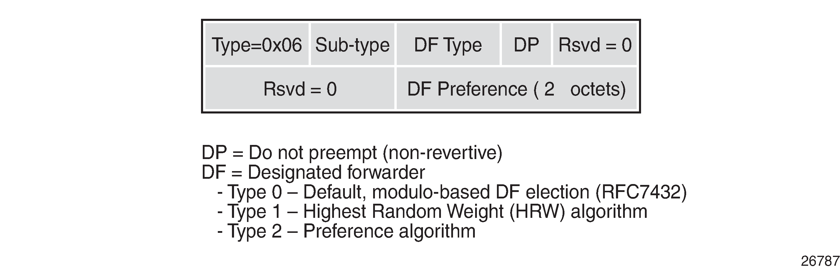 BGP-EVPN extended community for DF election shows the BGP-EVPN extended community defined for DF election and the different values described in draft-ietf-bess-evpn-pref-df.