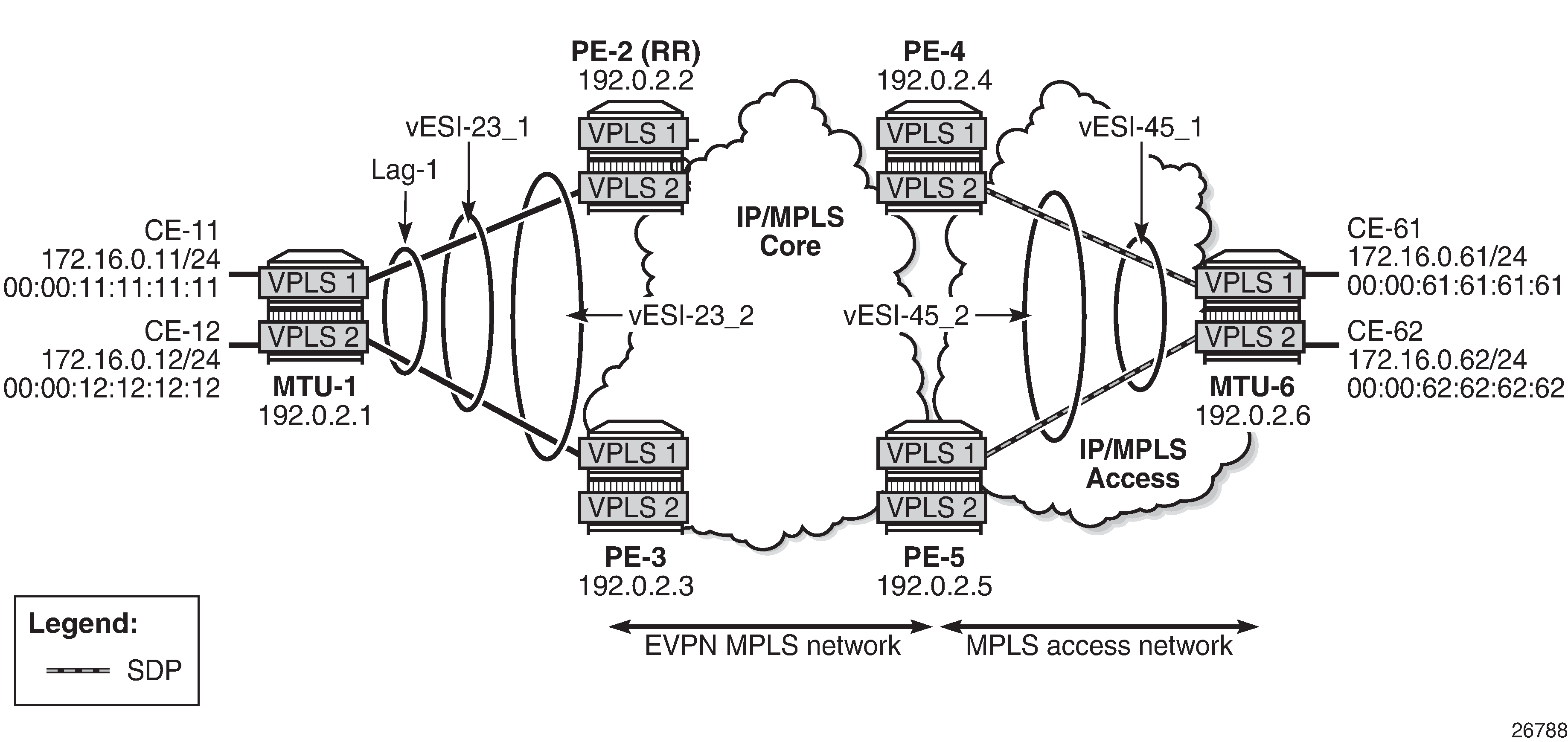 Example topology with all-active and single-active vESs shows the example topology with six nodes. EVPN-MPLS is configured between the core PE nodes. All-active vESs are configured between PE-2 and PE-3 and single-active vESs are configured between PE-4 and PE-5.