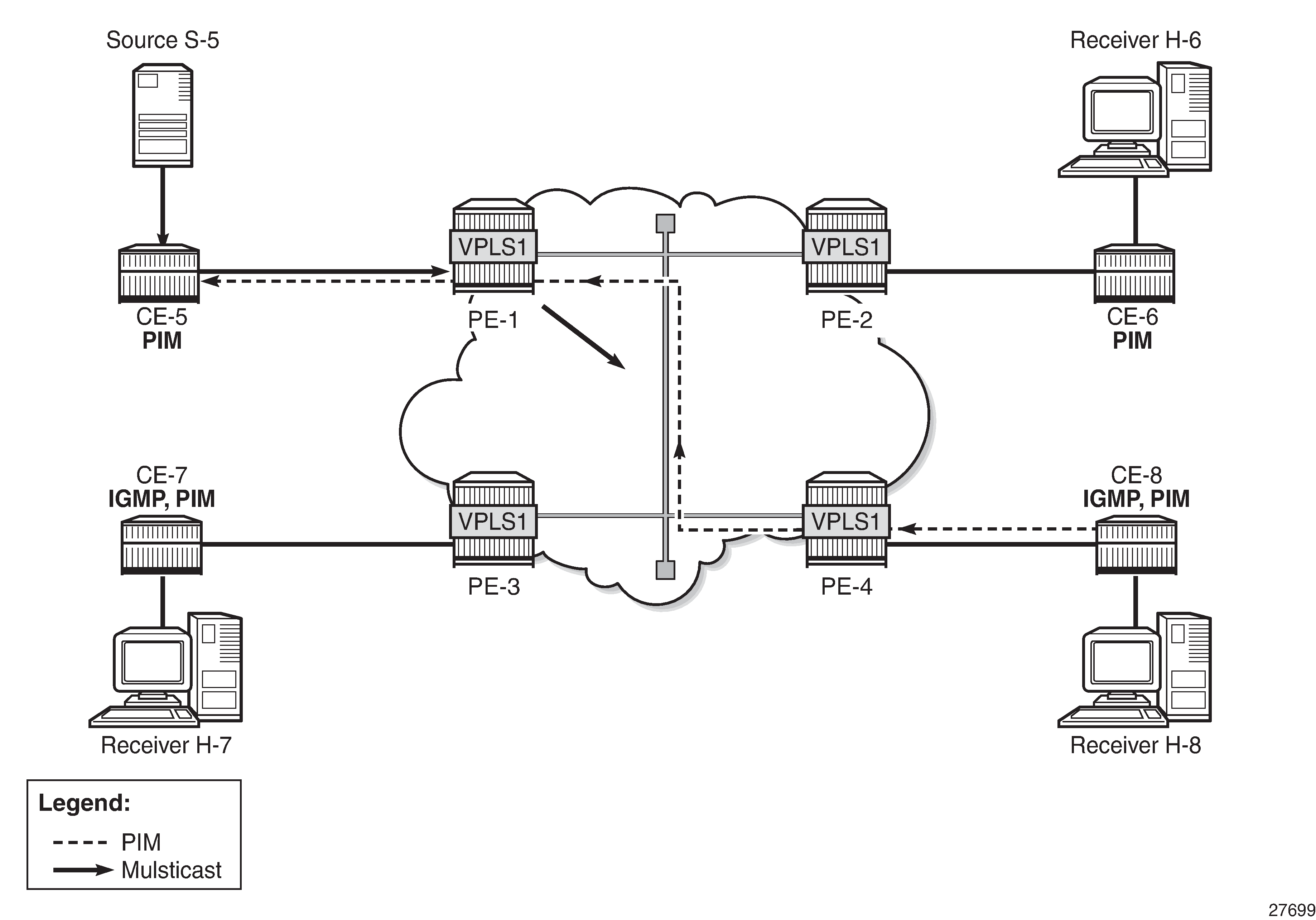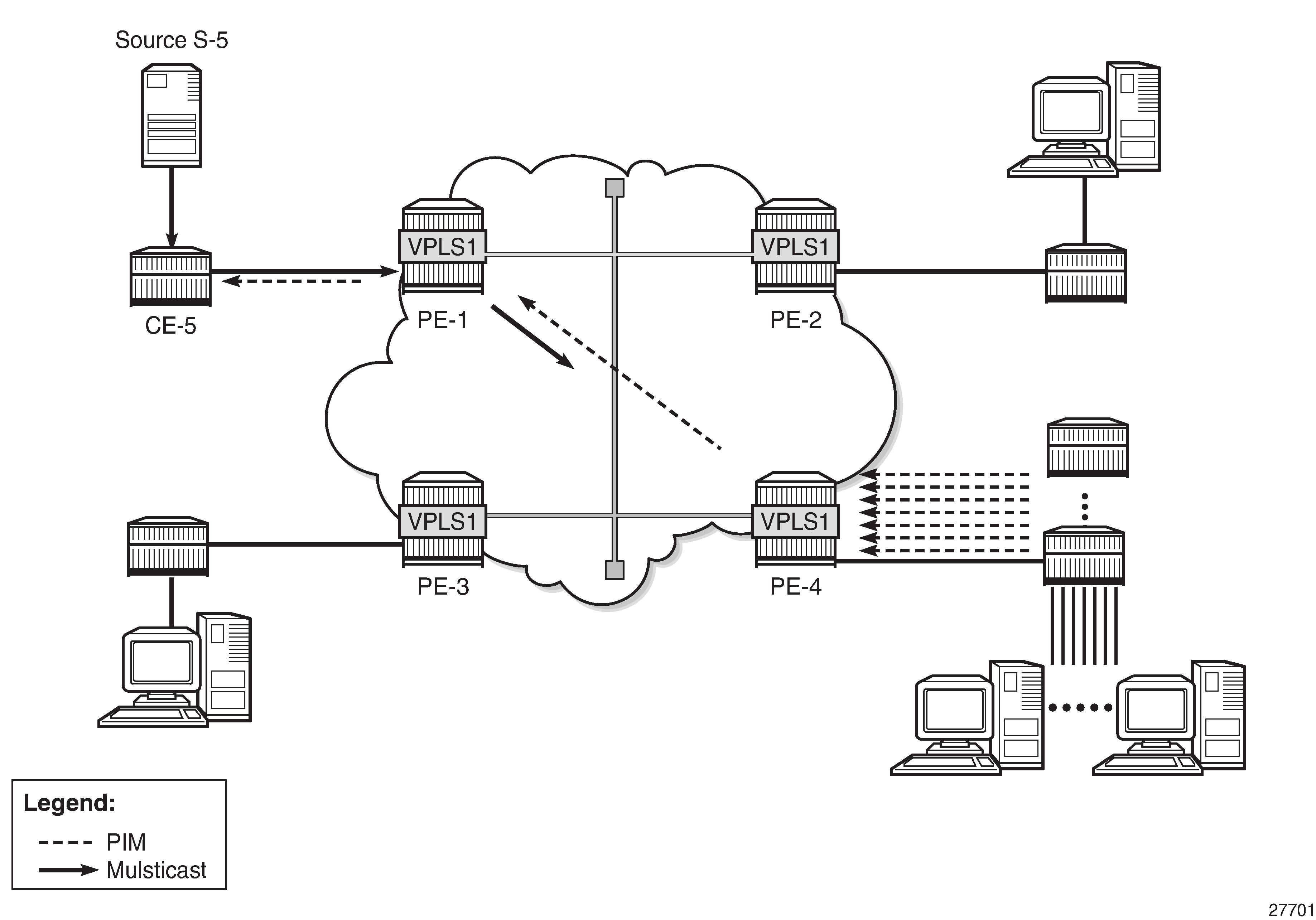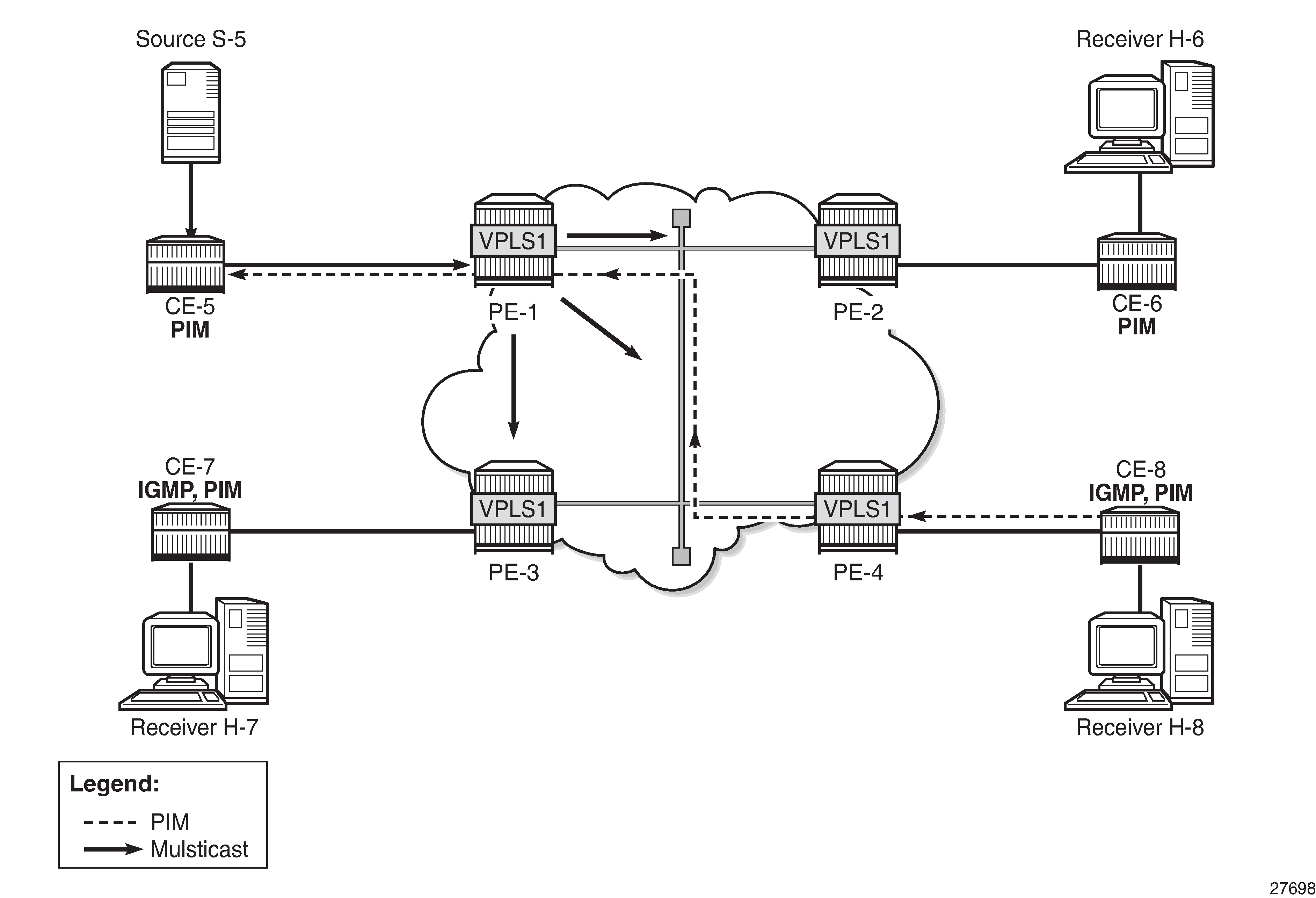 The source S-5 is sending the multicast stream to CE-5. When CE-5 receives a PIM join message for this multicast group from CE-8, it forwards the multicast stream to CE-8. By default, all PEs flood the multicast stream on all their connections in the VPLS domain, regardless of whether a PIM join was received from that connection. L2 flooding is not aware of the PIM join/prune messages from the L3 edge routers, resulting in an inefficient use of network resources. To avoid this L2 flooding, PIM snooping can be enabled in the VPLS by the following command: