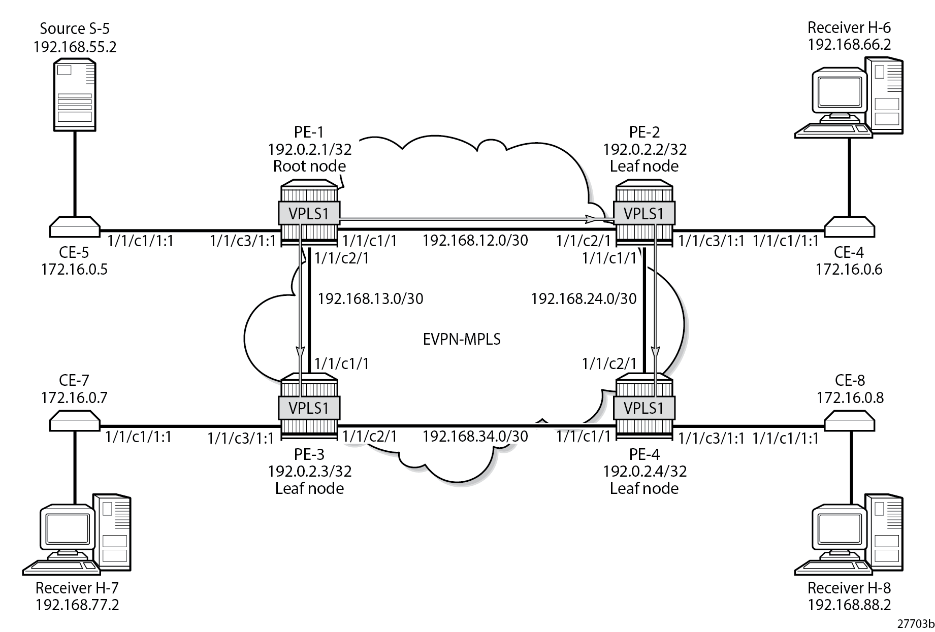 The PEs can expect to receive IP multicast traffic and PIM messages from leaf nodes over their EVPN-MPLS endpoints, or over the P2MP LSPs for traffic from root nodes.