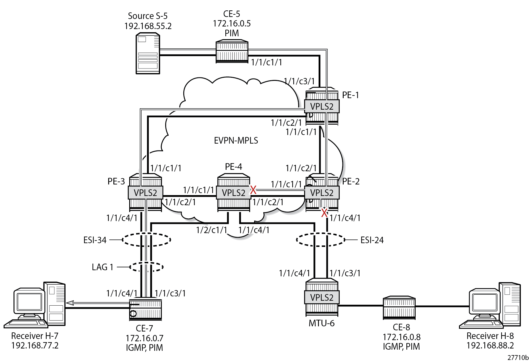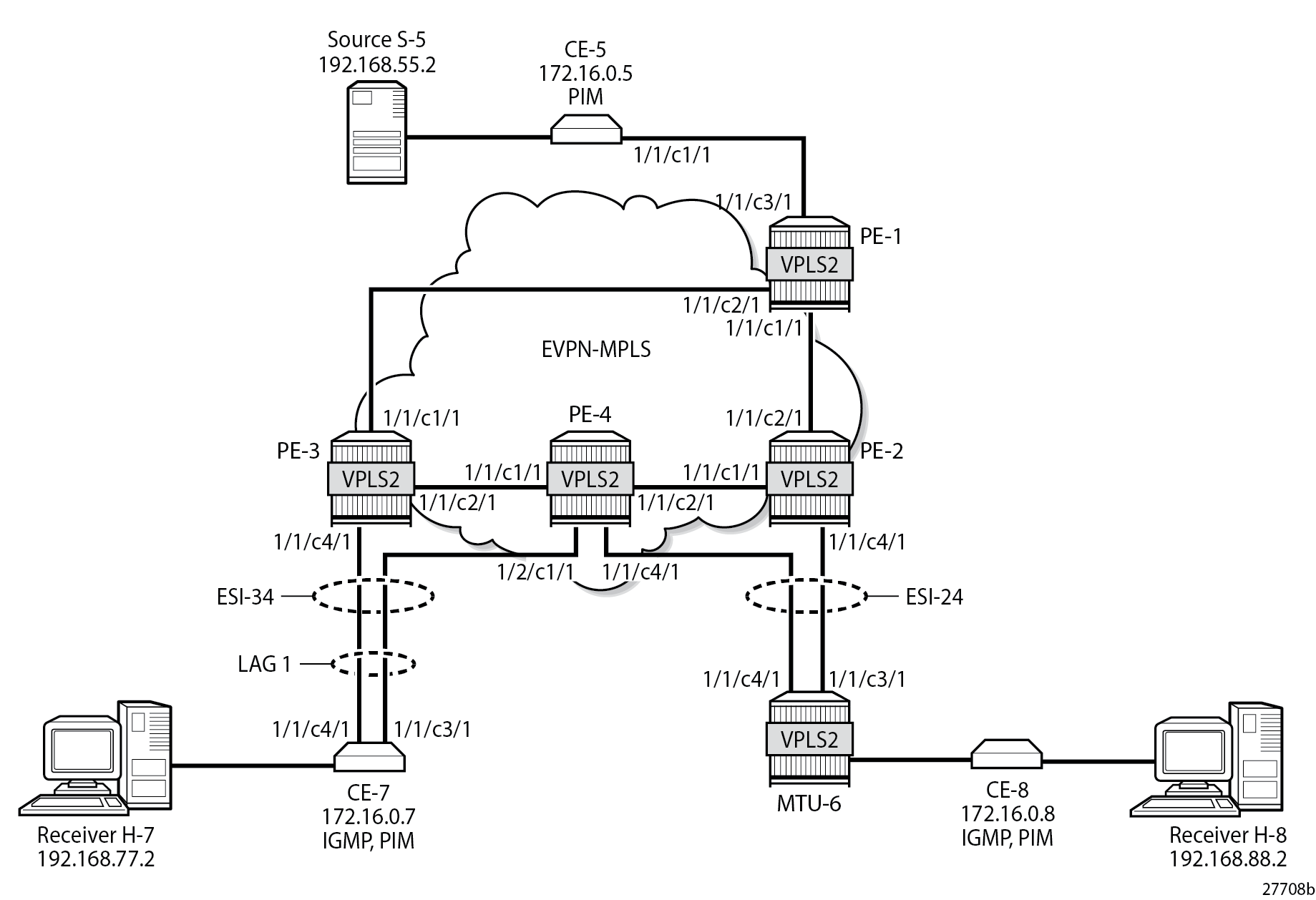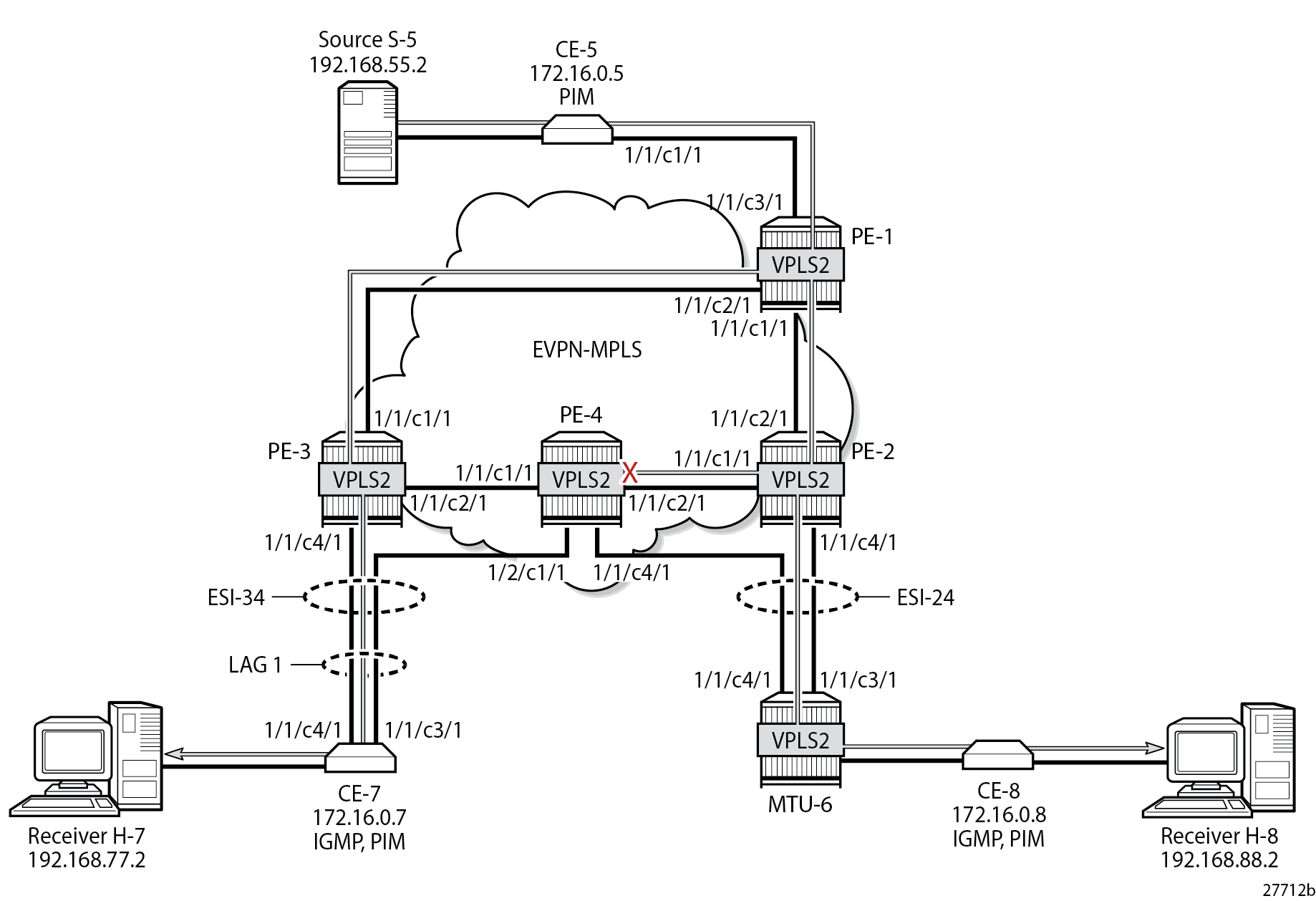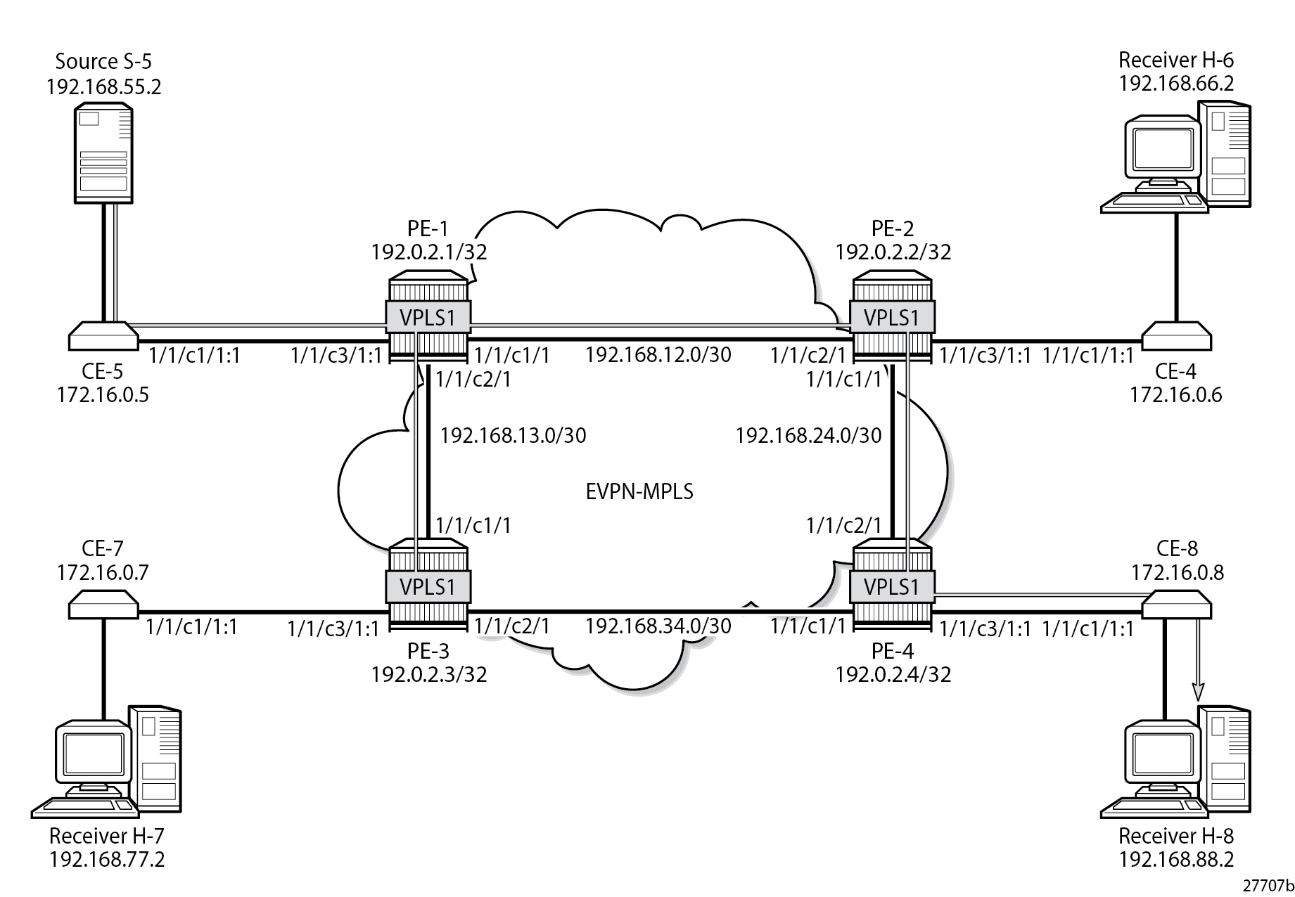 This chapter was initially written based on SR OS Release 15.0.R5, but the CLI in the current edition corresponds to SR OS Release 23.7.R1. PIM snooping for IPv4 is supported in EVPN-MPLS services in SR OS Release 15.0.R1, and later. PIM snooping in single-active multi-homing mode without ESI label is supported in SR OS Release 15.0.R1, and later, whereas PIM snooping in single-active multi-homing mode with ESI label is supported in SR OS Release 15.0.R4, and later. PIM snooping in all-active multi-homing mode is supported in SR OS Release 15.0.R4, and later. Data-driven PIM state synchronization is supported in SR OS Release 15.0.R4, and later.