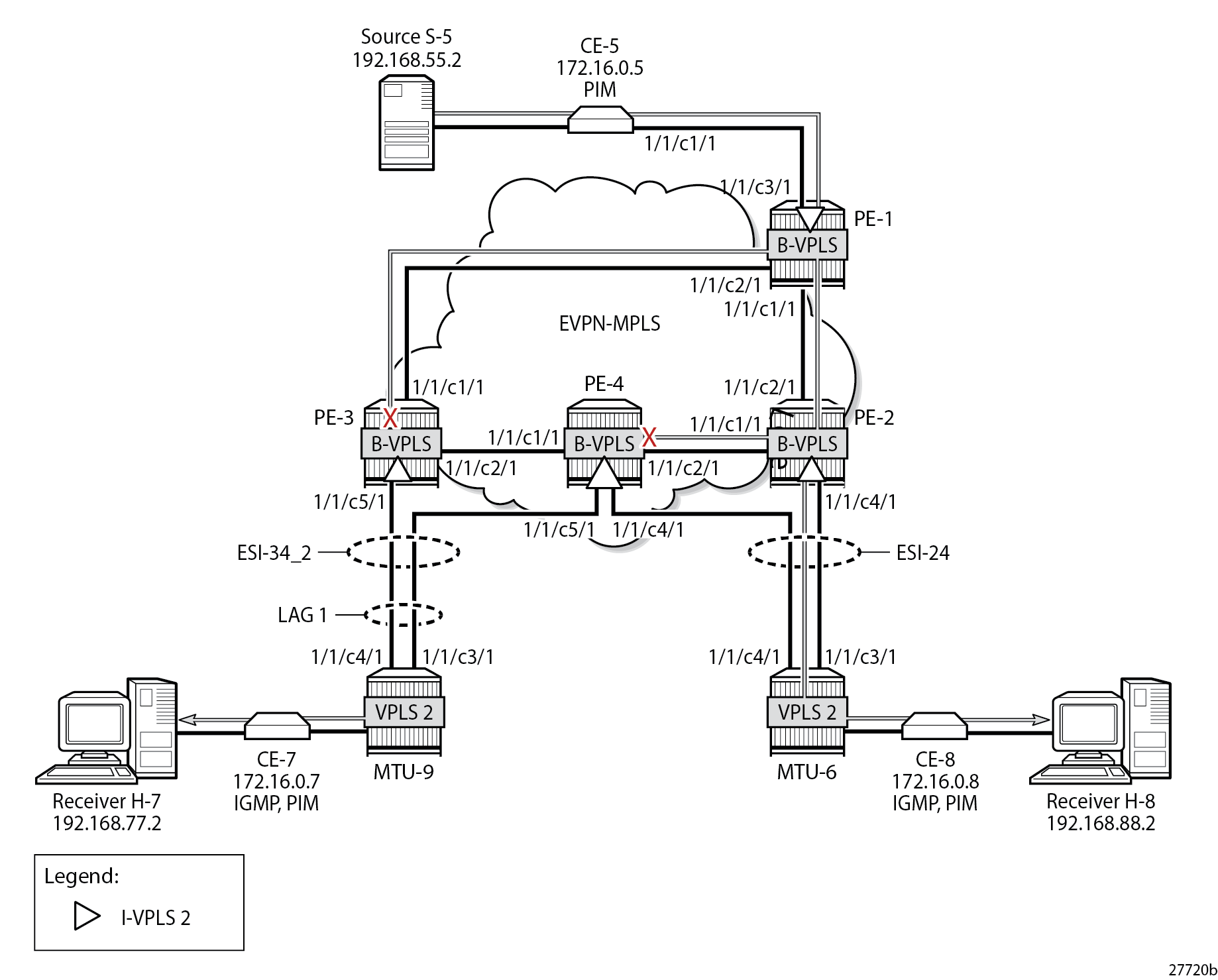EVPN-MPLS with MH and PIM Snooping – Receivers H-7 and H-8 Joined showed the multicast traffic flow when both H-7 and H-8 have joined the multicast group. PE-2 is the DF for ESI-24 and PE-4 is the DF for ESI-34_2. The following failures are introduced to force a failover from PE-2 to PE-4 and from PE-3 to PE-4. Data-driven PIM state synchronization is used for all-active MH; MCS is configured for fast failover in the single-active MH ES ESI-24.