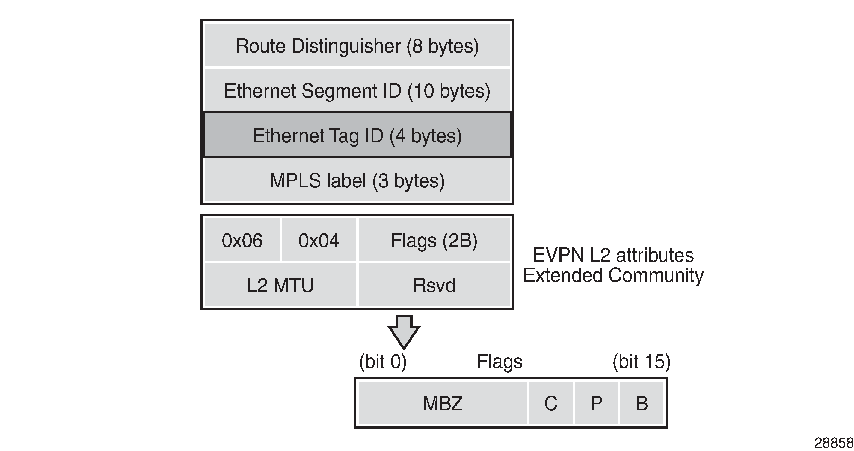 The EVPN L2 attributes extended community has type 0x06 (EVPN) and subtype 0x04 (EVPN L2 attributes). The flags are defined as follows: