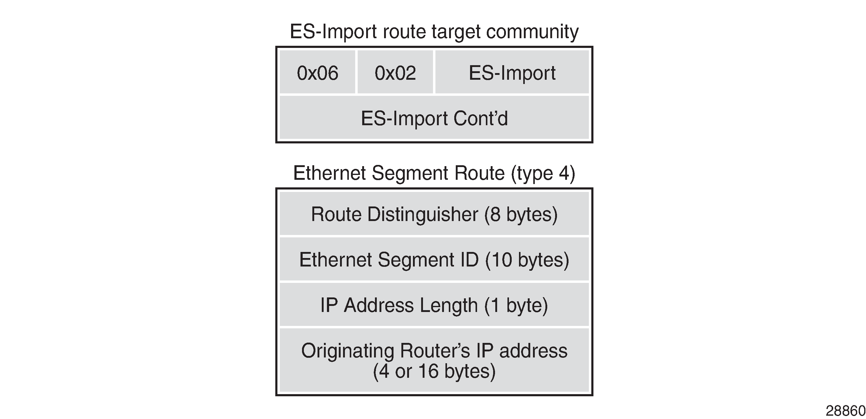 The RD is taken from the system level RD; by default, the RD is derived as system-IP:0, such as 192.0.2.4:0 for PE-4. The ESI contains the 10-byte identifier as configured in the ES. The ES import route target community has type 0x06 (EVPN) and subtype 0x02 (ES import route target), and is derived from the MAC address portion of the ESI. This extended community is treated as a route target, such as: target:00:00:00:00:45:00. Only the PEs attached to the ES will import the ES route.