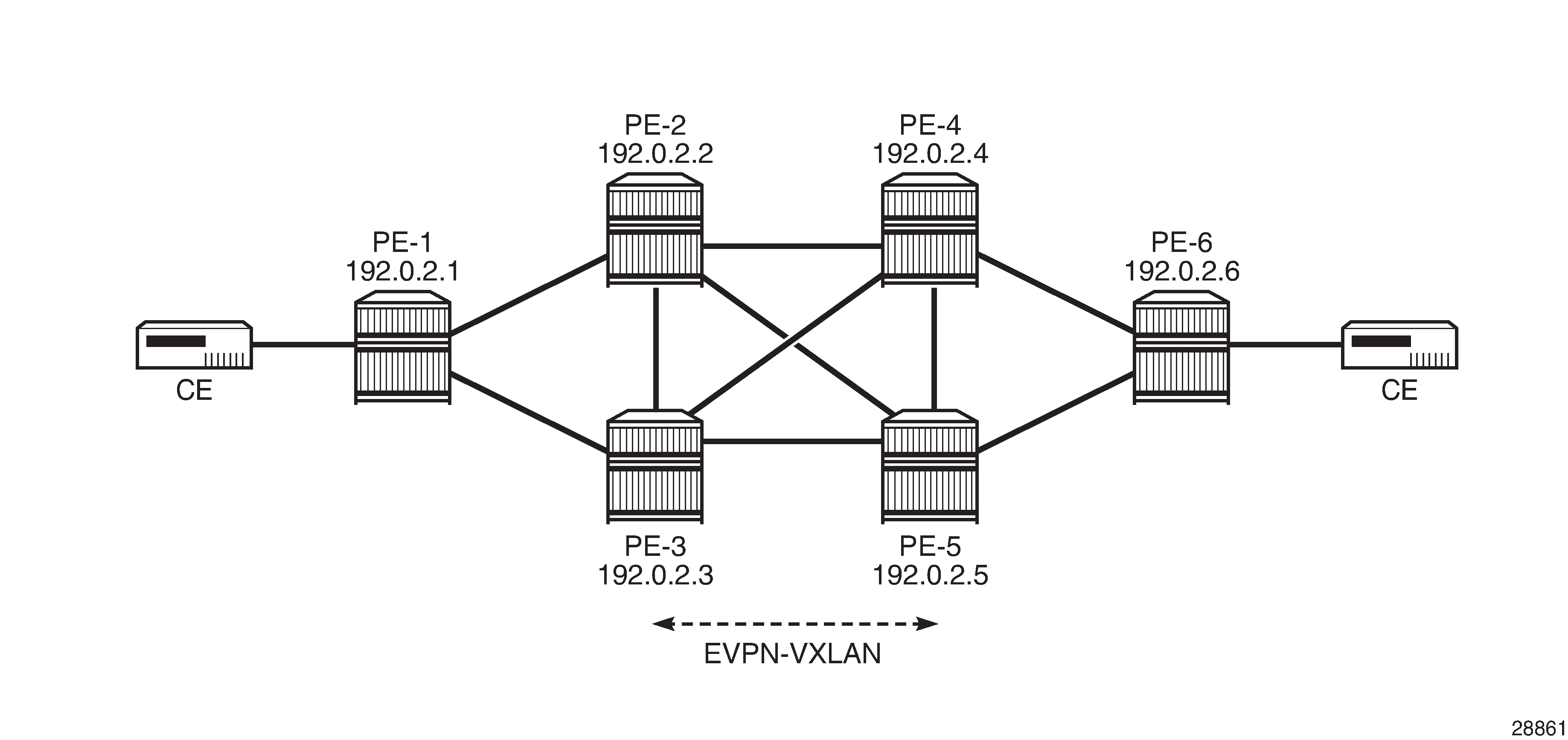 By default, the system IP addresses are used for the VXLAN tunnel termination. However, it is possible to use non-system IPv4 or IPv6 termination for EVPN-VXLAN VPWS, both for single-homed and multi-homed services. In that case, Forwarding Path Extension (FPE) needs to be defined with VXLAN termination, as described in chapter Static VXLAN Termination in Epipe Services.