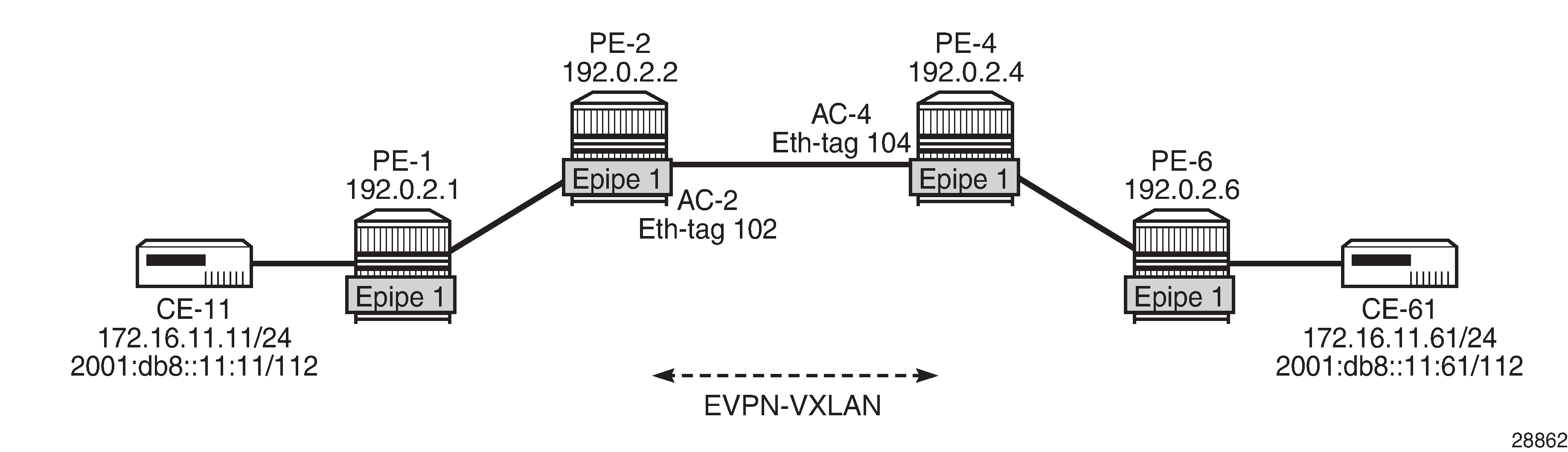 EVPN-VXLAN VPWS is similar to EVPN-MPLS VPWS, including support of Equal Cost Multi-Path (ECMP), and EVPN All-Active (AA) and Single-Active (SA) Multi-Homing (MH). The configuration resembles the EVPN-MPLS Epipe configuration, as described in the EVPN for MPLS Tunnels in Epipe Services (EVPN-VPWS) chapter. As an example, the following configures EVPN-VXLAN Epipe 4 with SA MH.