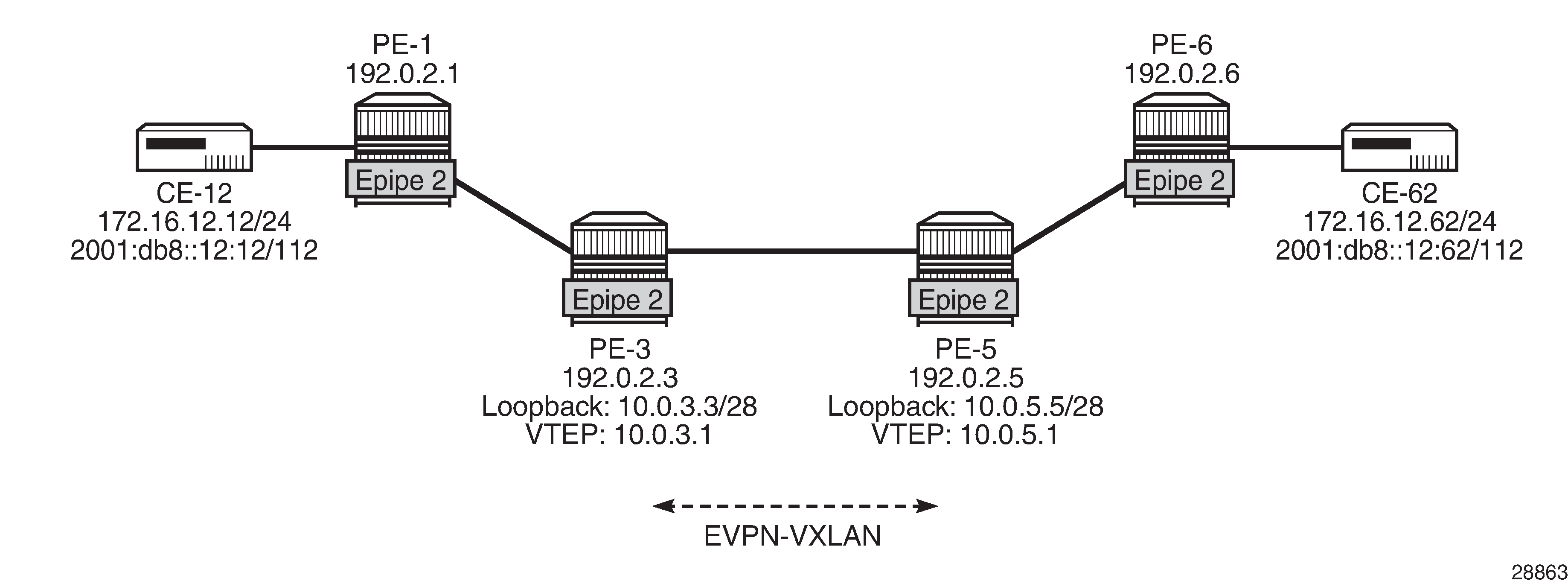 The following shows the configuration of the single-homed Epipe 2 using non-system IPv4 source VXLAN Tunnel Endpoint (VTEP) 10.0.3.1 on PE-3. Likewise, it is possible to use a non-system IPv6 source VTEP, such as vxlan-src-vtep 2001::3:1. Unlike the source VTEP, the egress VTEP cannot be configured when BGP-EVPN is enabled. The egress VTEP is dynamically learned via BGP instead.