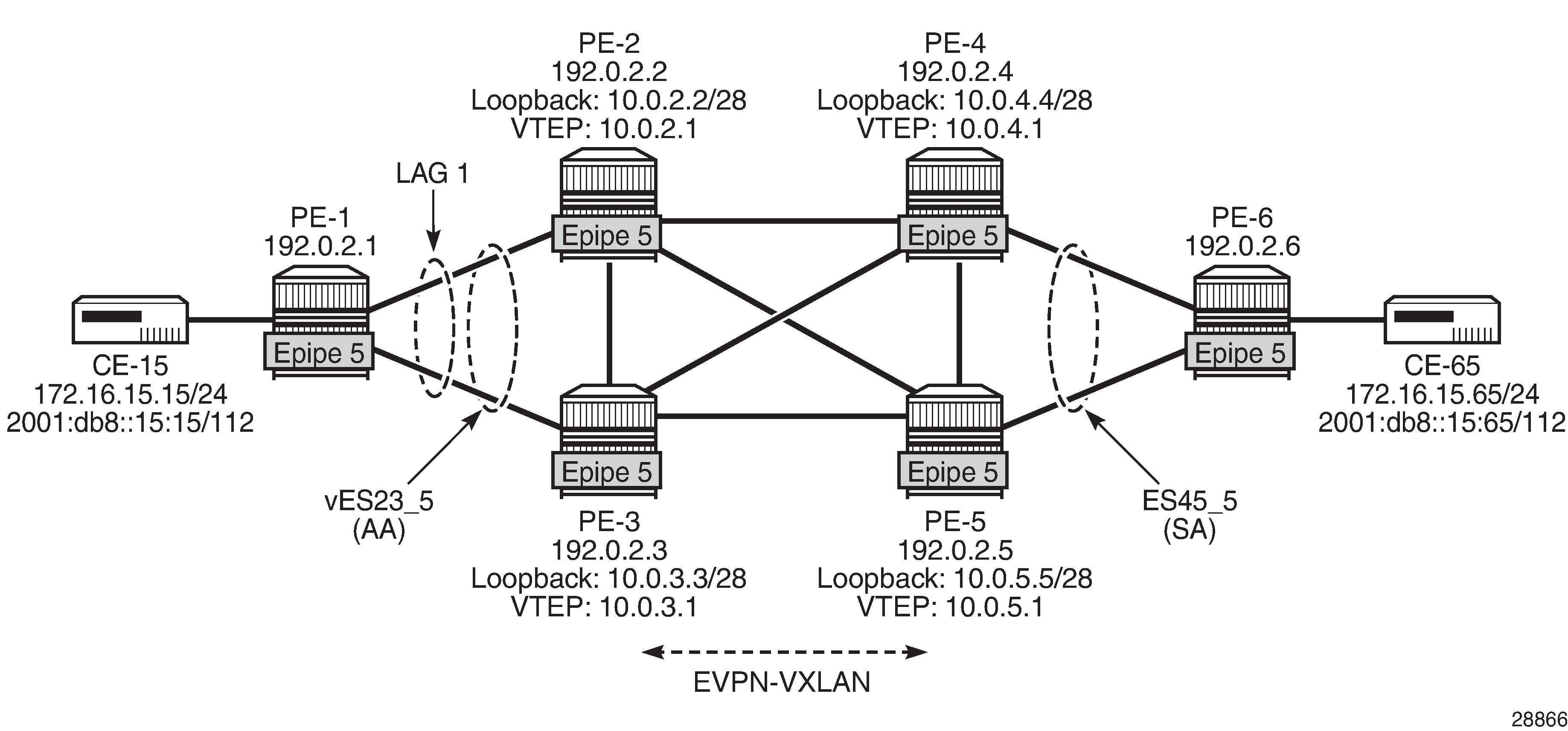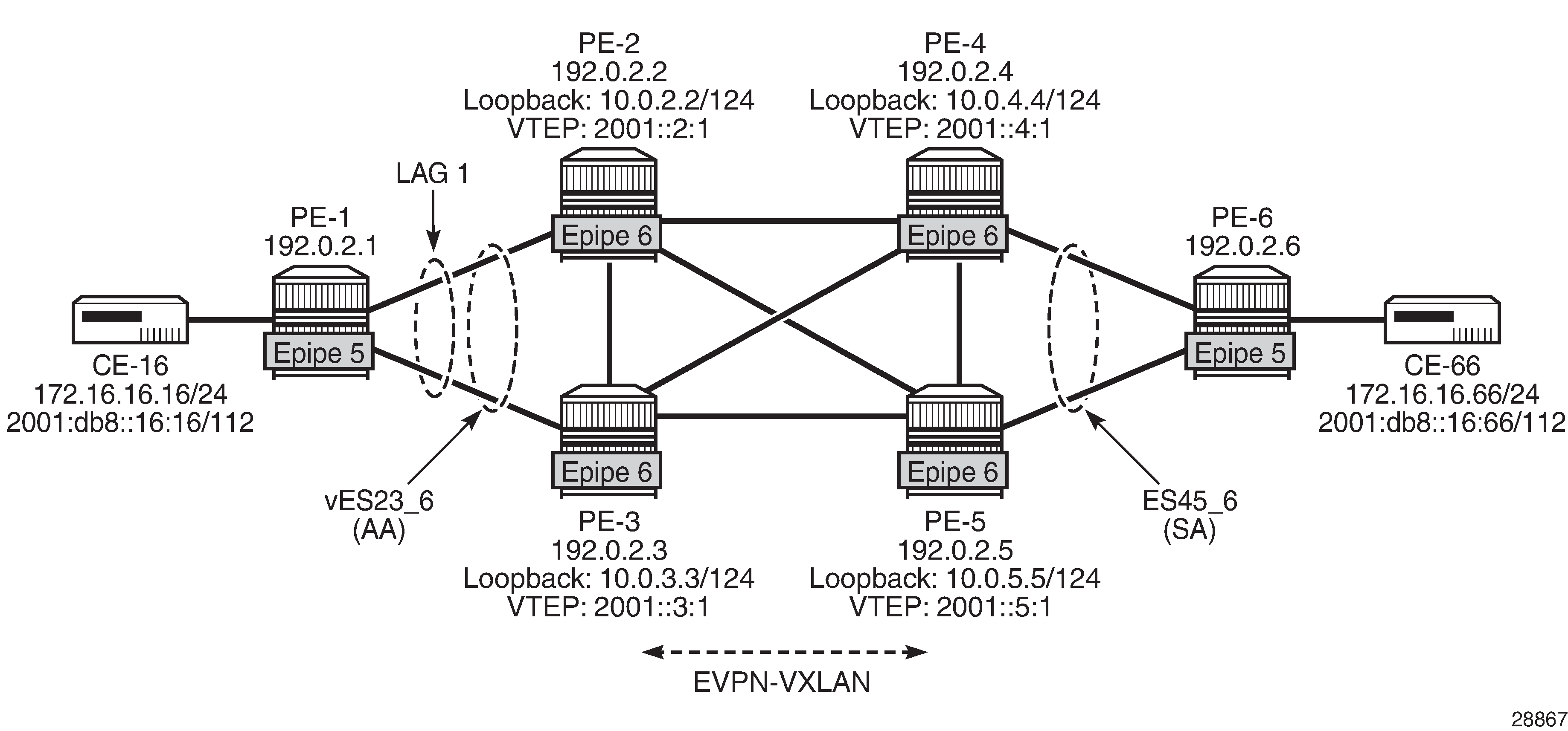 EVPN-VXLAN Epipe 6 with AA MH and SA MH using non-system IPv6 addresses shows the example topology for EVPN-VXLAN Epipe 6 with AA MH ES "vES23_6" between PE-2 and PE-3 and SA MH ES "ES45_6" between PE-4 and PE-5.