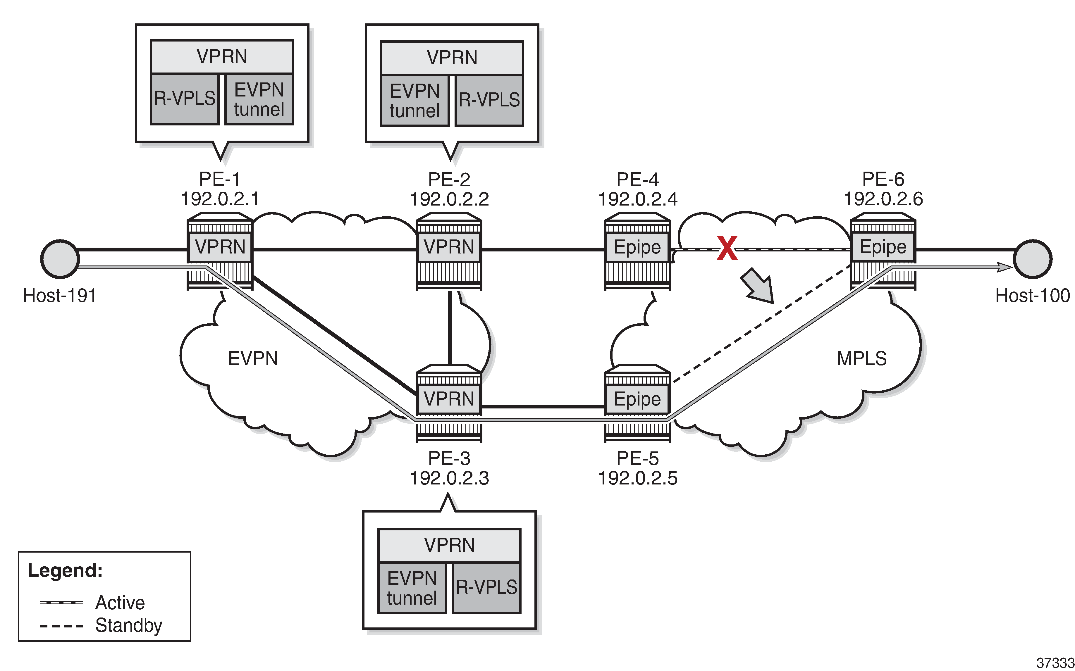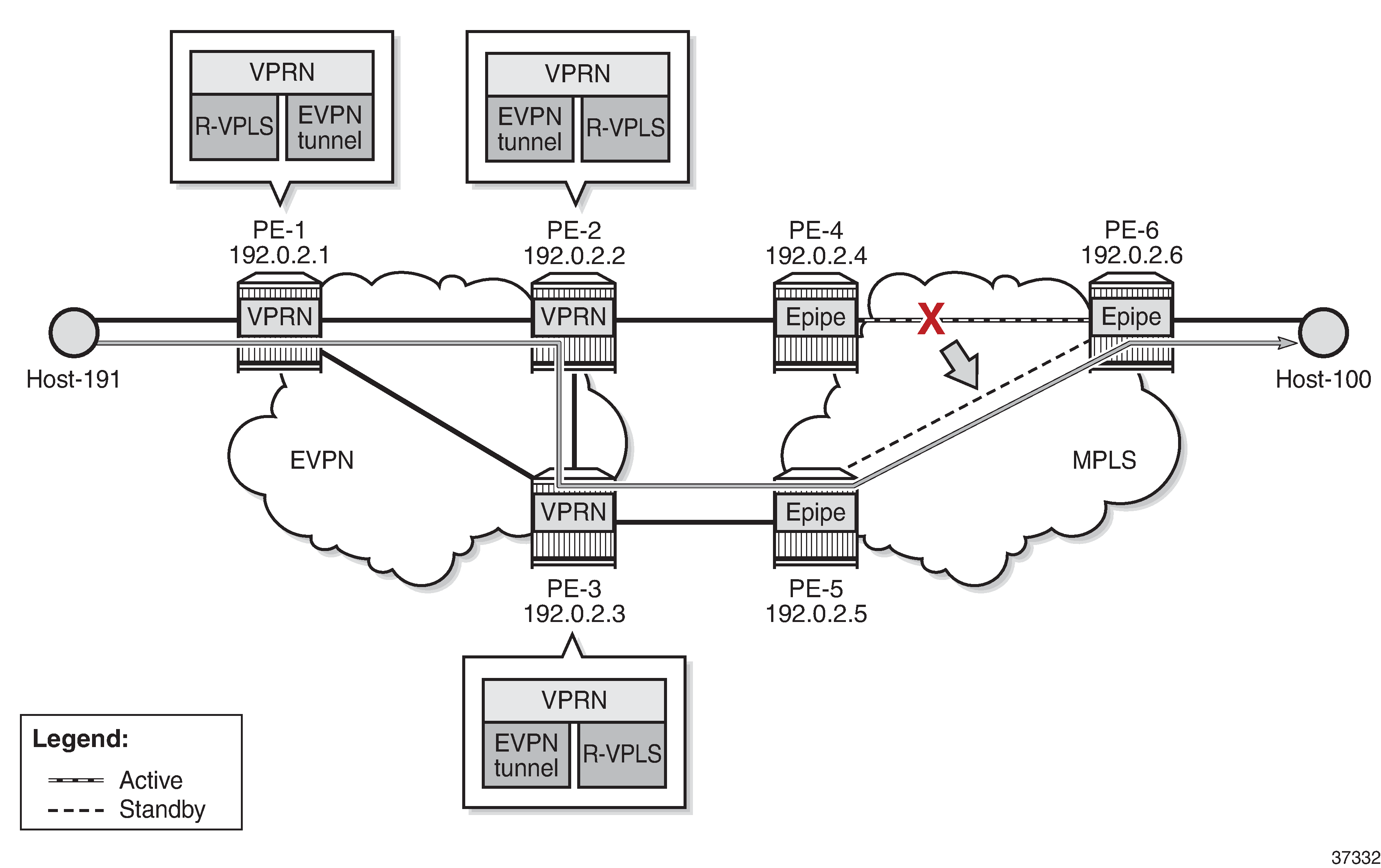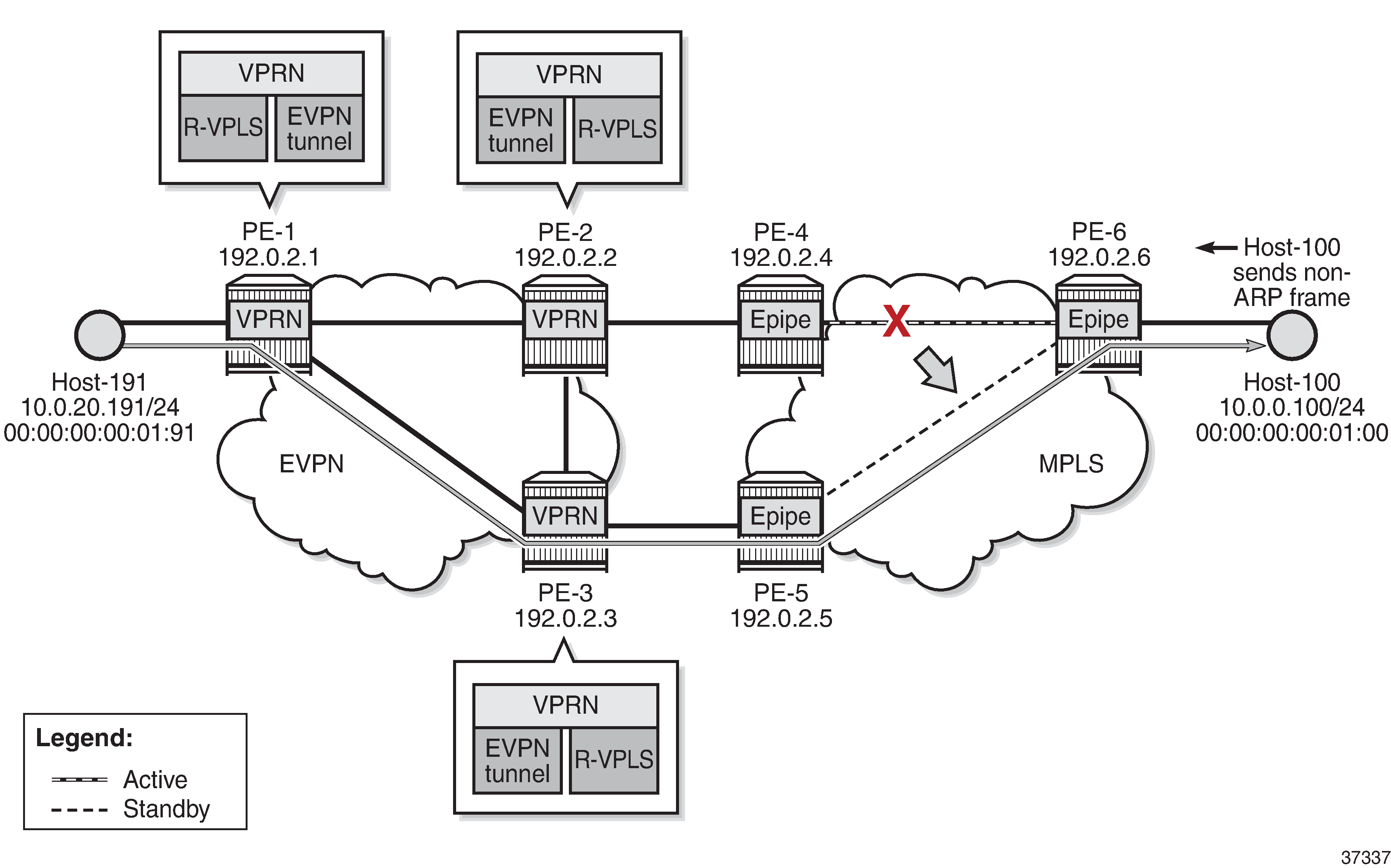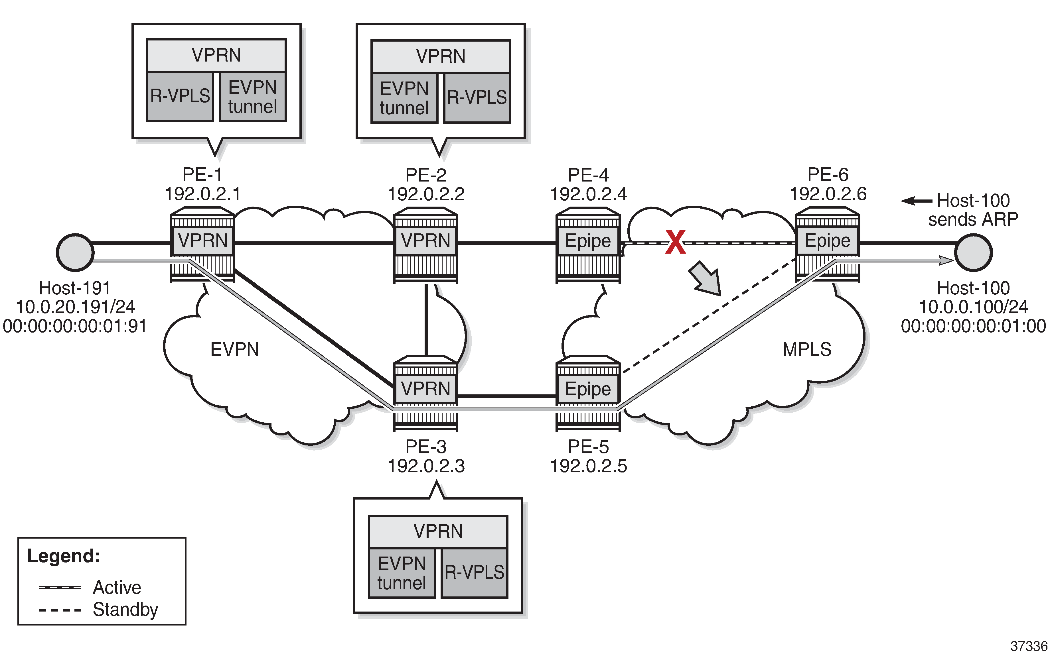 When host-100 comes up, it sends a Gratuitous Address Resolution Protocol (GARP) message that is then learned on PE-2 and PE-3. PE-2 and PE-3 are configured to advertise host routes, so they generate an RT5 host route for prefix 10.0.0.100/32 of host-100. PE-3 selects its best RT5 for 10.0.0.100/32 and traffic from host-191 to host-100 uses the path via PE-1, PE-2, PE-4, and PE-6. However, when the active path between PE-4 and PE-6 fails, the standby path between PE-5 and PE-6 takes over and hairpinning occurs when PE-1 continues selecting PE-2 as the next hop, while a more efficient path is possible via next-hop PE-3. Traffic from host-191 to host-100 uses the path via PE-1, PE-2, PE-3, PE-5, and PE-6.