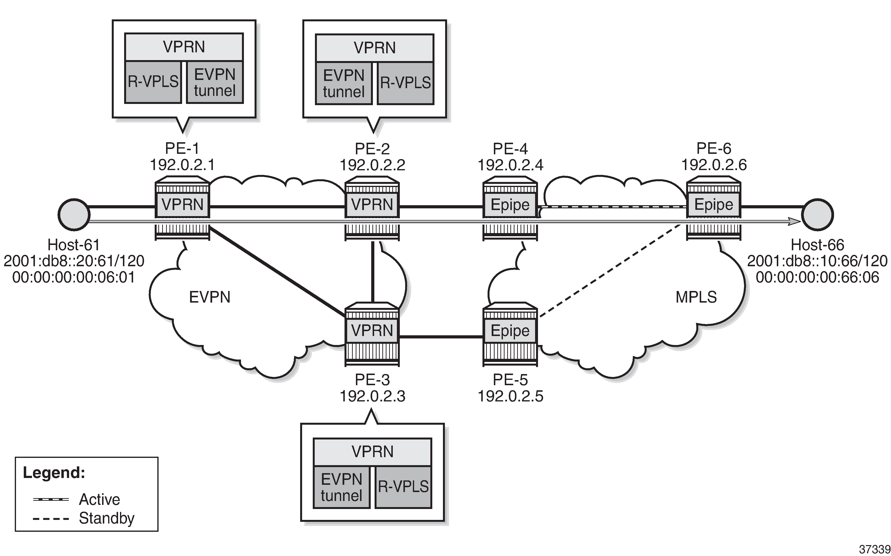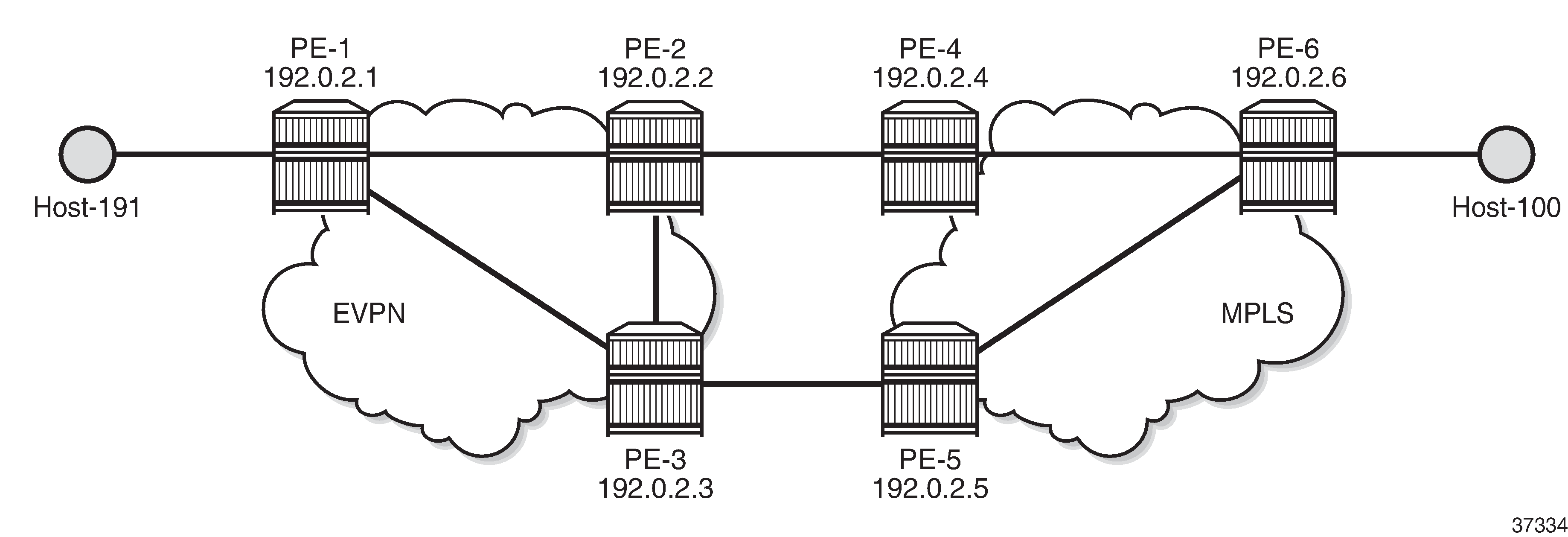 Example topology with system IP addresses shows the example topology with PE-1, PE-2, and PE-3 in an EVPN-MPLS network and PE-4, PE-5, and PE-6 in an MPLS network.