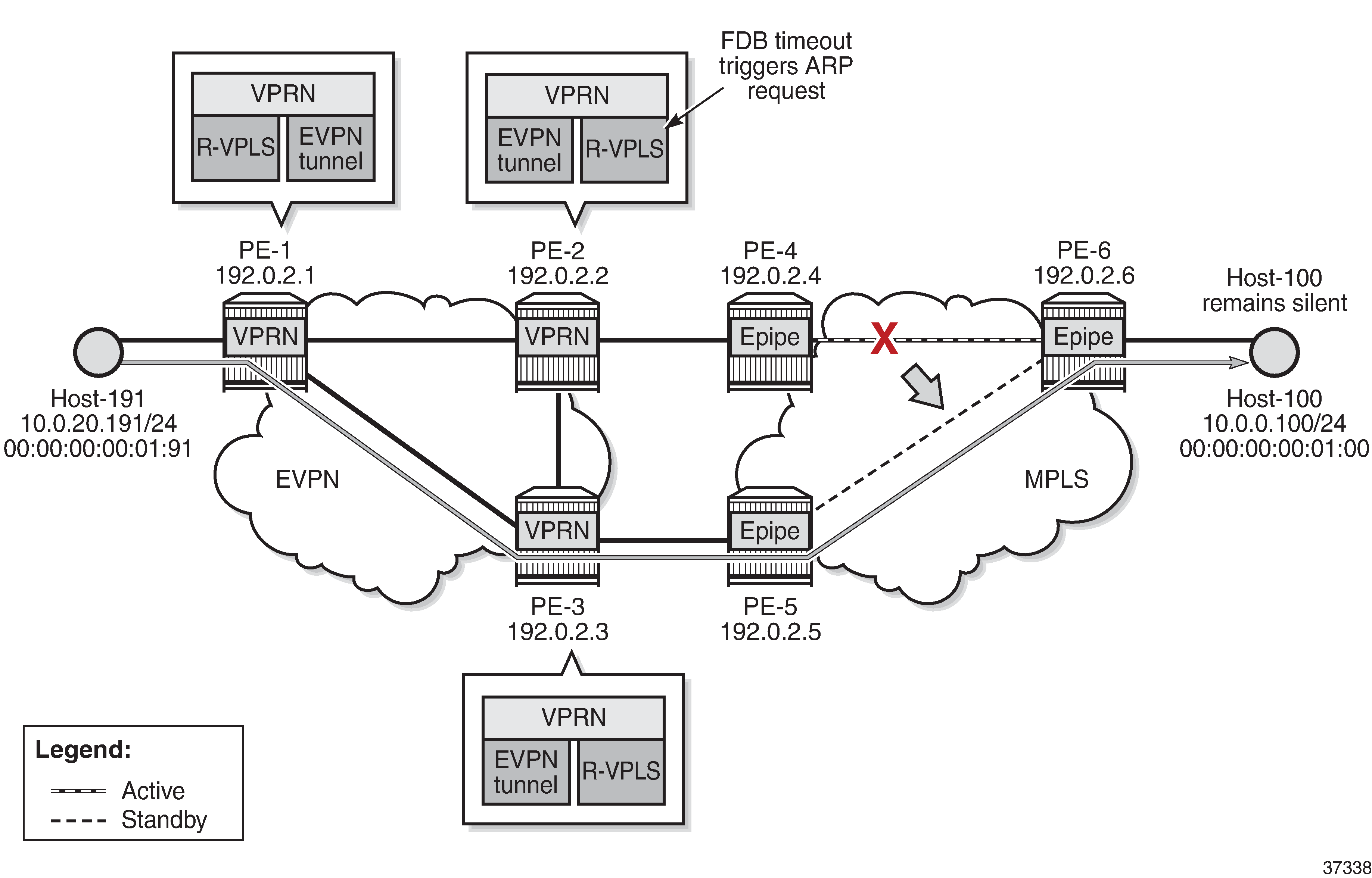 The host does not send any traffic and the source PE generates an ARP request when the MAC address of the host expires and the EVPN-MAC is withdrawn.