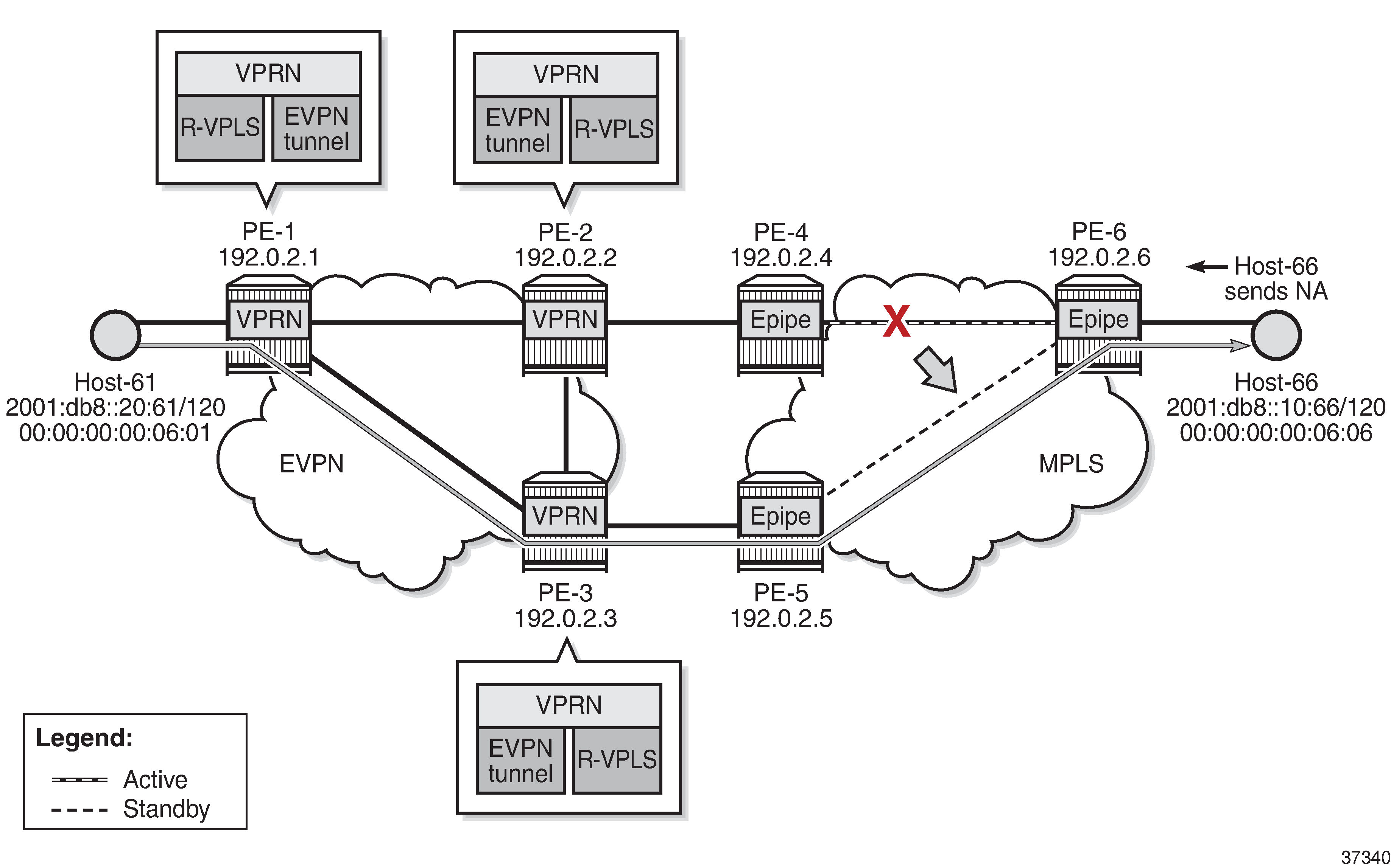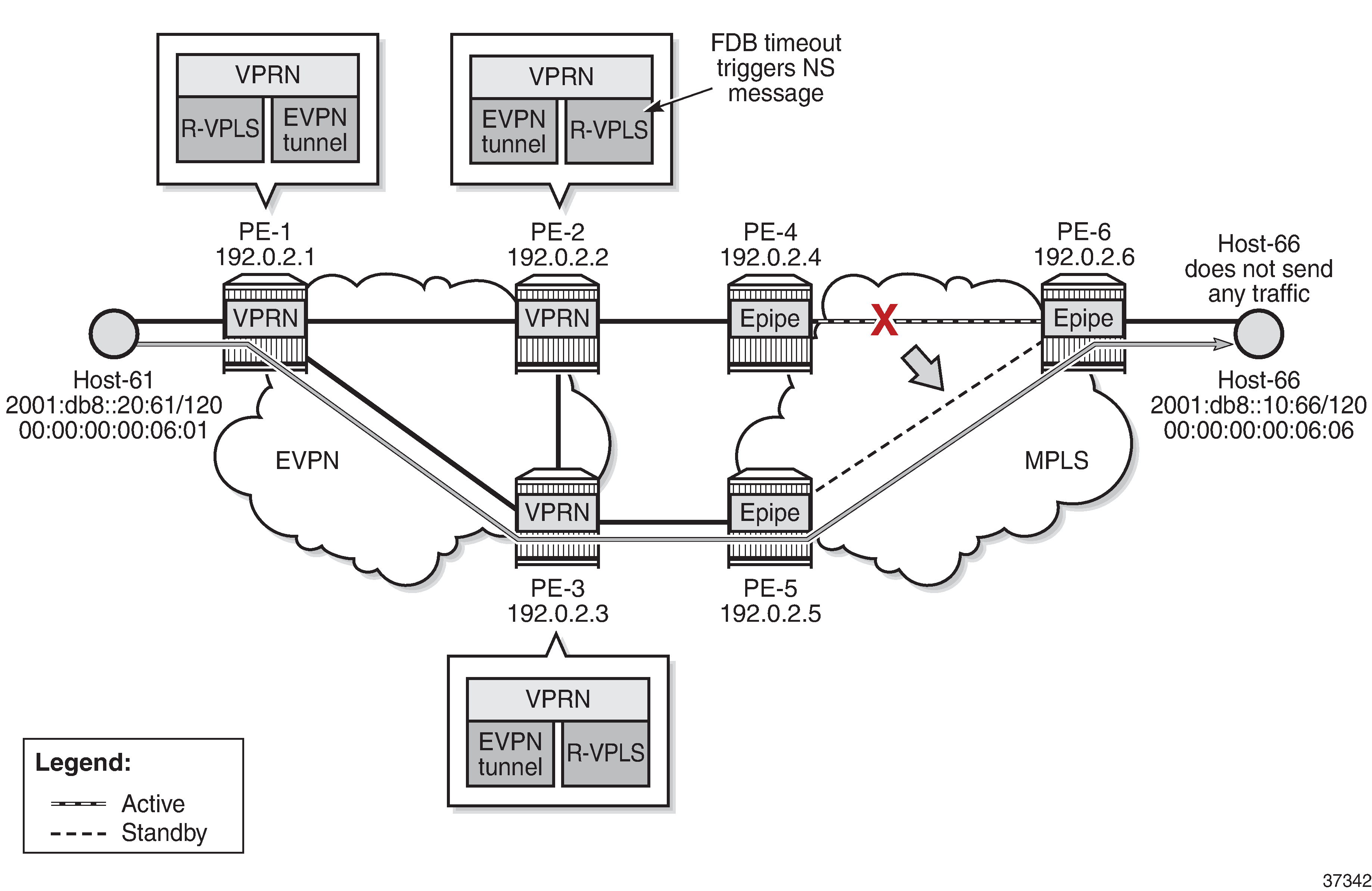 A failure is simulated, causing a failover from the primary path via PE-4 to the secondary path via PE-5. Host-66 does not send any traffic after switchover. Host does not send any traffic after switchover shows that PE-2 sends an NS message when the FDB entry for host-66 ages out.