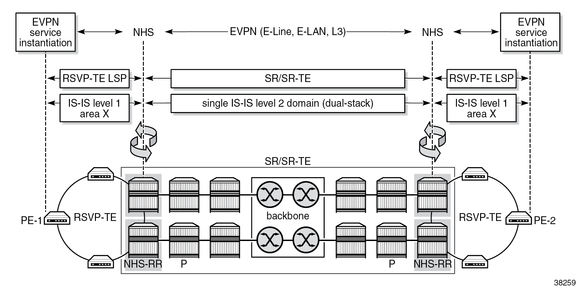 - dual EVPN-MPLS instance VPLS services on the NHS-RRs