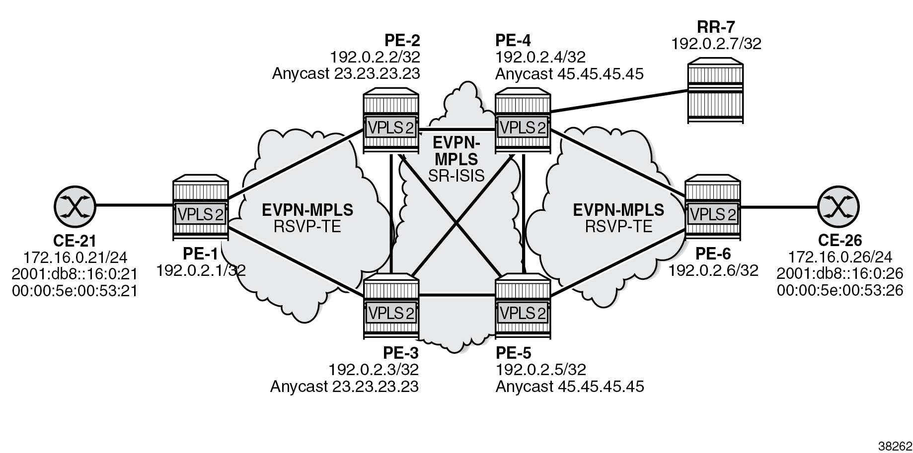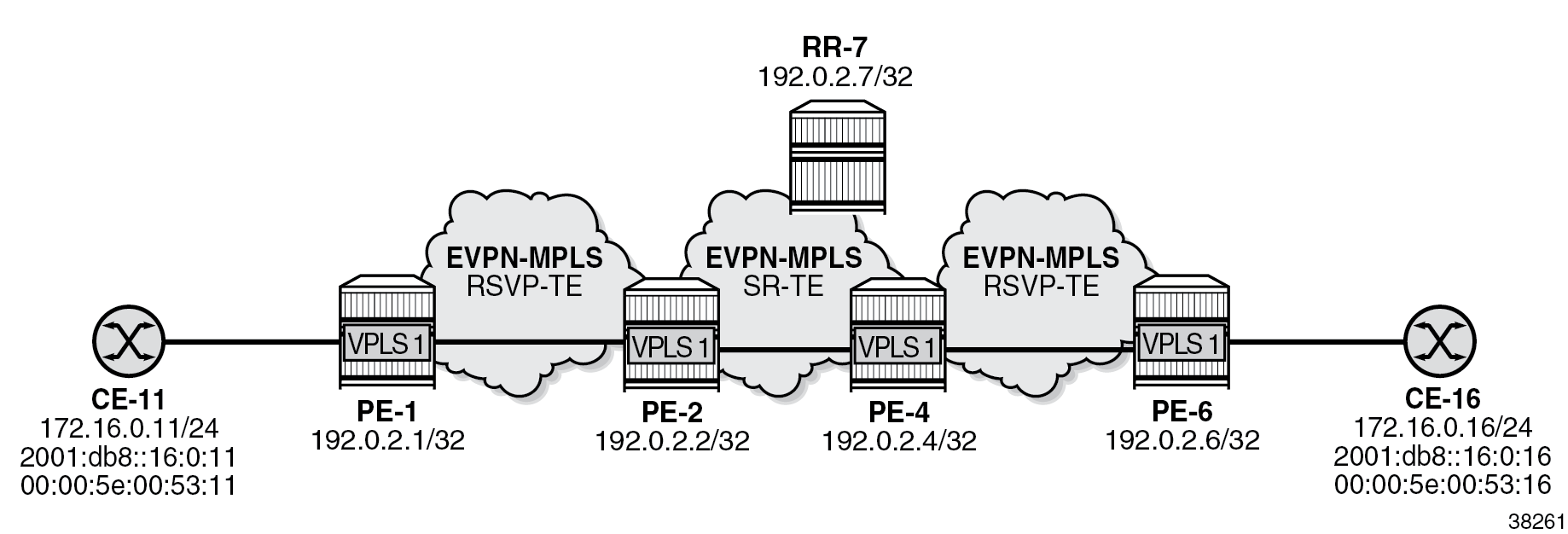 Example topology 1 shows EVPN-MPLS VPLS 1 configured on four PEs. PE-2 and PE-4 are EVPN gateways (GWs). RR-7 is the route reflector for PE-2 and PE-4 in the WAN network.