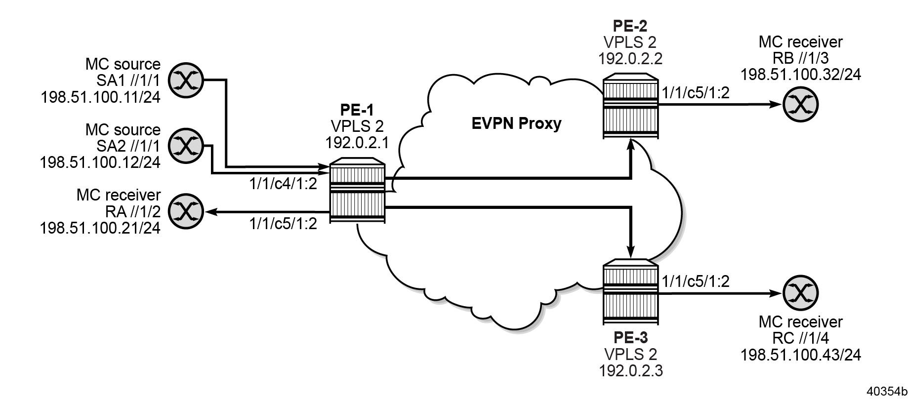 As in the case for one MC source SA1, PE-1 receives (SA1,G2) SMET from PE-2 and (*,G2) SMET from PE-3, but does not generate a corresponding S-PMSI A-D route for either of these SMET routes. PE-2 and PE-3 only install the wildcard S-PMSI route. PE-2 and PE-3 receive MC traffic from the wildcard S-PMSI trees for VPLS 2. The MFIB for VPLS 2 in PE-1 has the (SA1,G2), the (*,G2) and the wildcard entries. MC traffic of SA1 is forwarded out of the ports that are associated with the (SA1,G2) entry and MC traffic of SA2 is forwarded out of the ports that are associated with the (*,G2) entry.