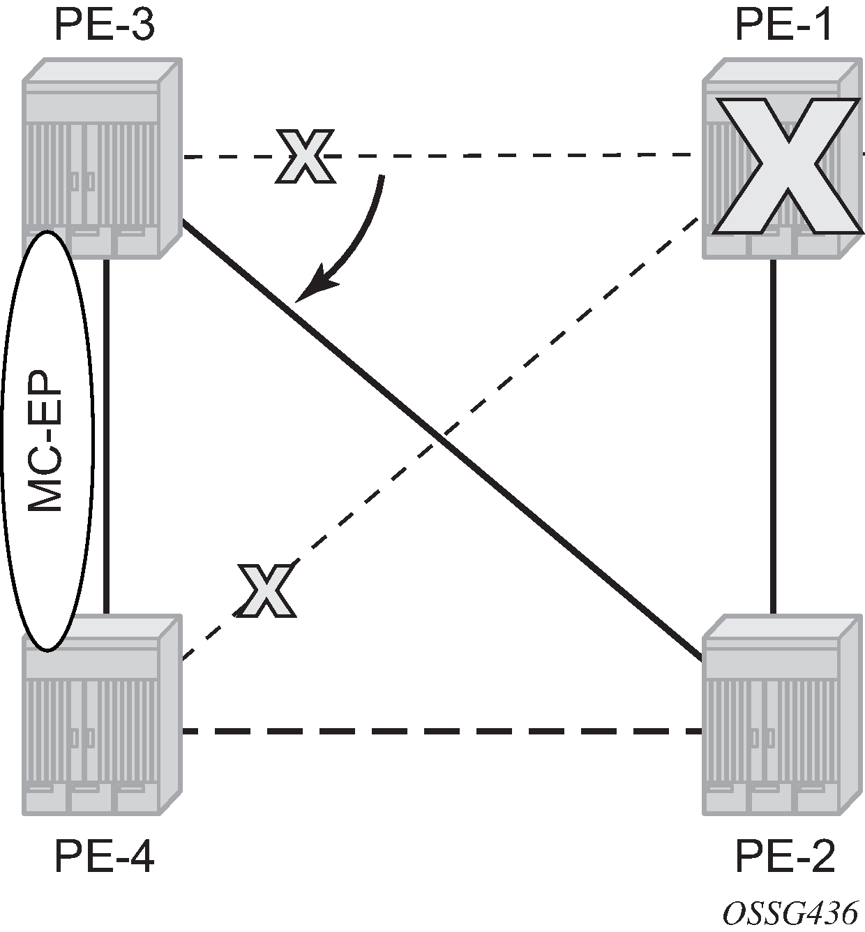 As in the preceding Multi-chassis communication failure subsection, if there is a failure in the multi-chassis communication, both nodes will assume that the peer is down and will revert to single-chassis mode. This can create loops because two spoke SDPs can become active.