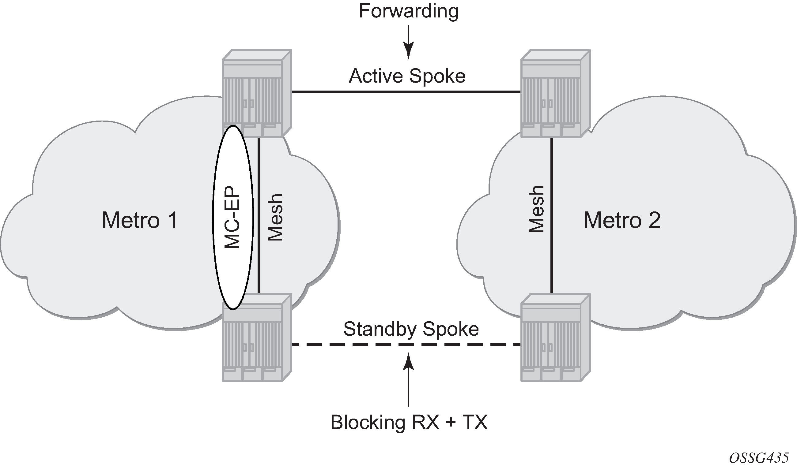In passive mode, both peers will stay dormant as long as one active spoke SDP is signaled from the remote end. If more than one spoke SDP becomes active, the MC-EP algorithm will select the best SDP. All other spoke SDPs are blocked locally (in Rx and Tx directions). There is no signaling sent to the remote PEs.