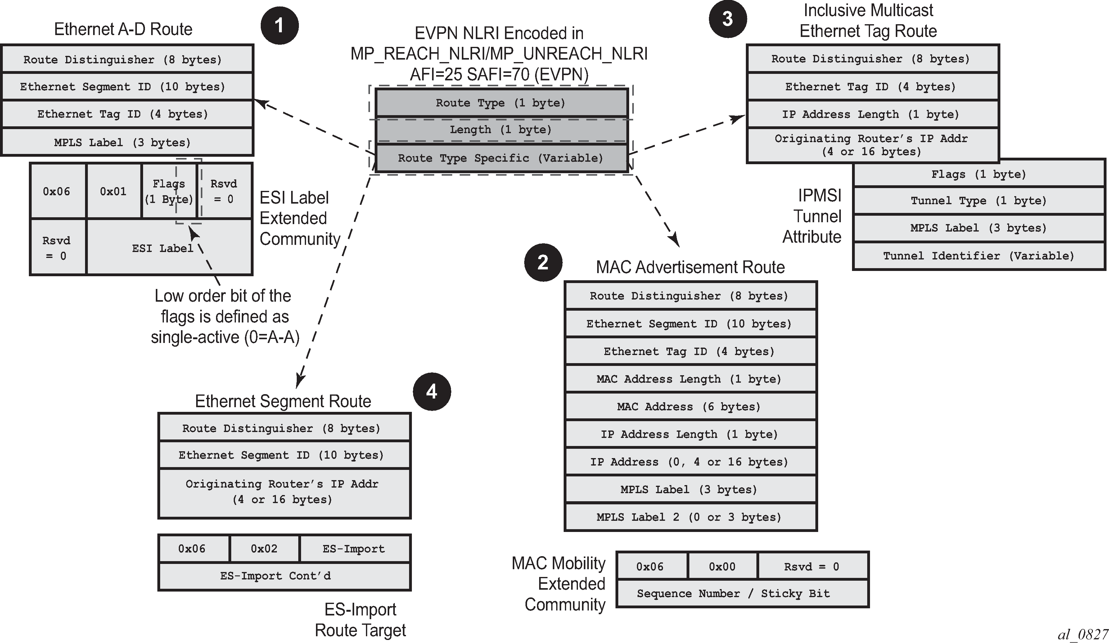 As a reference, the EVPN route types and NLRIs (Network Layer Reachability Information messages) used by the EVPN family in RFC 7432 are shown in EVPN route types and NLRIs.
