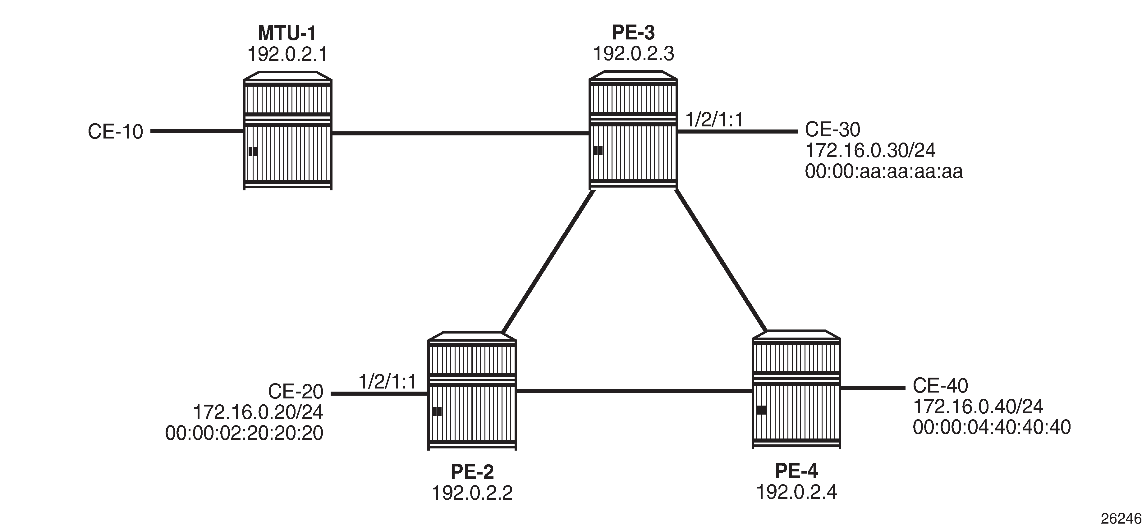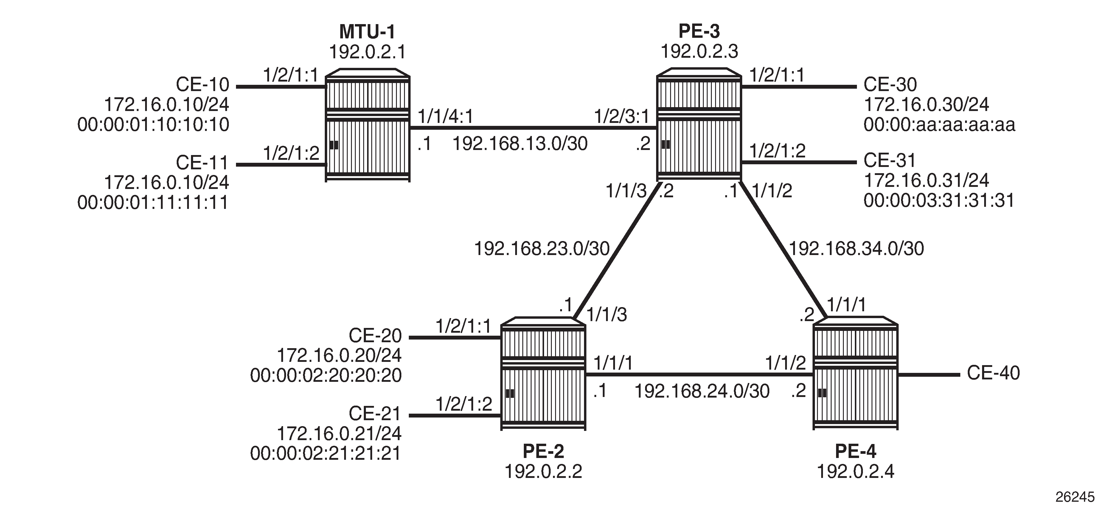 Example topology shows the example topology. Traffic will be sent between the CEs and may be dropped in the PEs if the MAC DA or MAC SA matches a black-hole MAC address. IP address 172.16.0.10/24 is duplicate (CE-10 and CE-11).