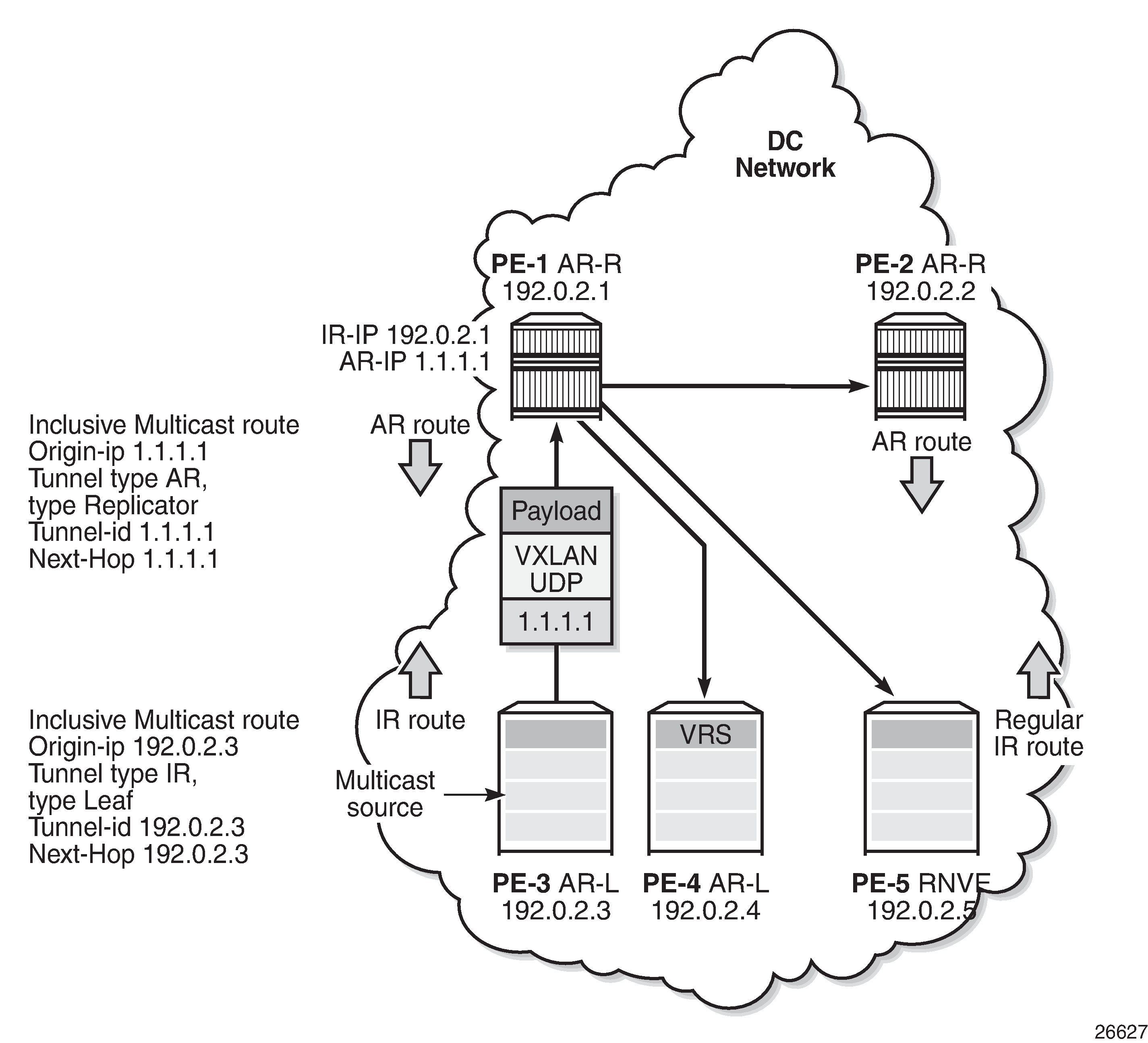 EVPN Assisted Replication for VXLAN shows the example topology with the multicast source connected to a hypervisor PE-3 that acts as AR-L, which sends an IR route containing the system address of PE-3. The AR-R PE-1 sends an AR route that uses AR-IPs instead of IR-IPs; for example, PE-1 has AR-IP 1.1.1.1 and IR-IP 192.0.2.1.