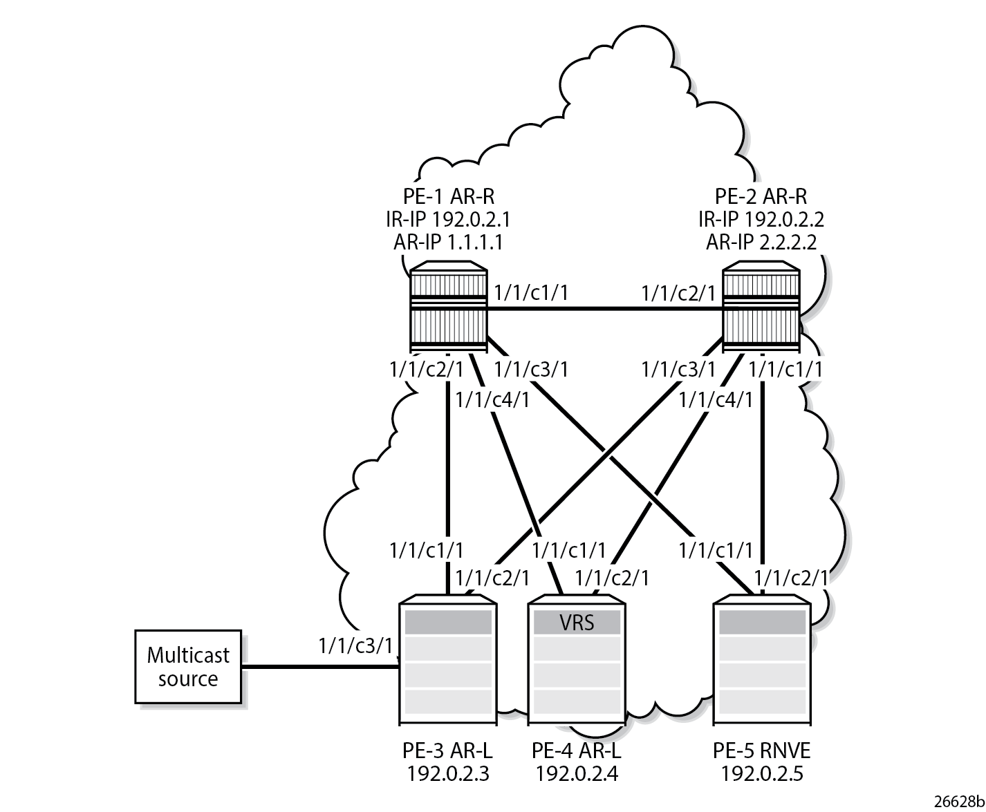 AR-R PE-1 receives the multicast traffic from PE-3 on port 1/1/c2/1 and forwards it to the egress ports 1/1/c3/1 toward PE-5 and 1/1/c4/1 toward PE-4, as follows. No multicast traffic needs to be forwarded to egress port 1/1/c1/1 toward PE-2. Source squelching ensures that the traffic is not sent back to the originator AR-L PE-3. PE-1 has no local SAPs or SDP-bindings.