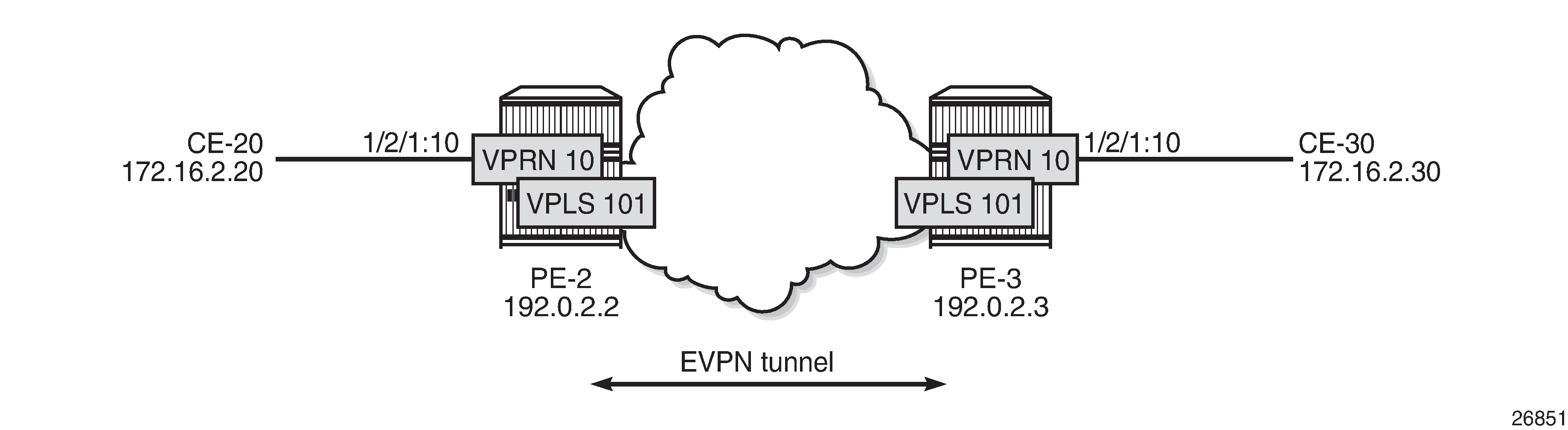 The CEs are connected to SAP 1/2/1:10 in VPRN 10. R-VPLS 101 is bound to VPRN 10 and VPRN 10 has a dedicated interface "int-evi-101" for the EVPN tunnel. In general, if only one route-target (RT) is used for import and export in the EVPN-VPLS, it is good to add the EVI and have the route distinguisher (RD) and RT auto-derived from the EVI. It is simpler and avoids configuration mistakes. The service configuration on PE-2 is as follows: