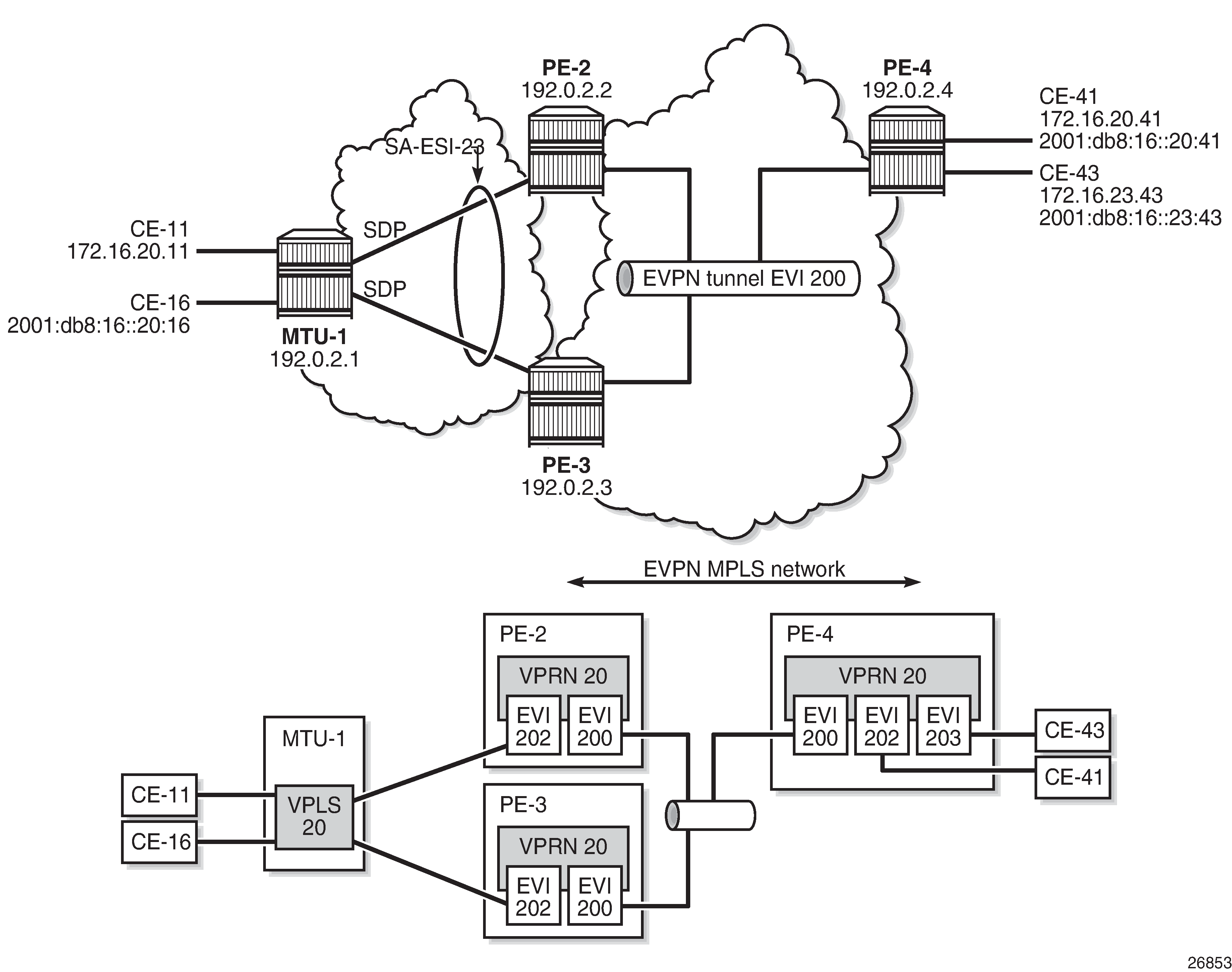 EVPN-MPLS R-VPLS with single-active multi-homing shows the example topology with single-active multi-homing ES "SA-ESI-23". The difference is that the ES is single-active and SDPs are used instead of a LAG.