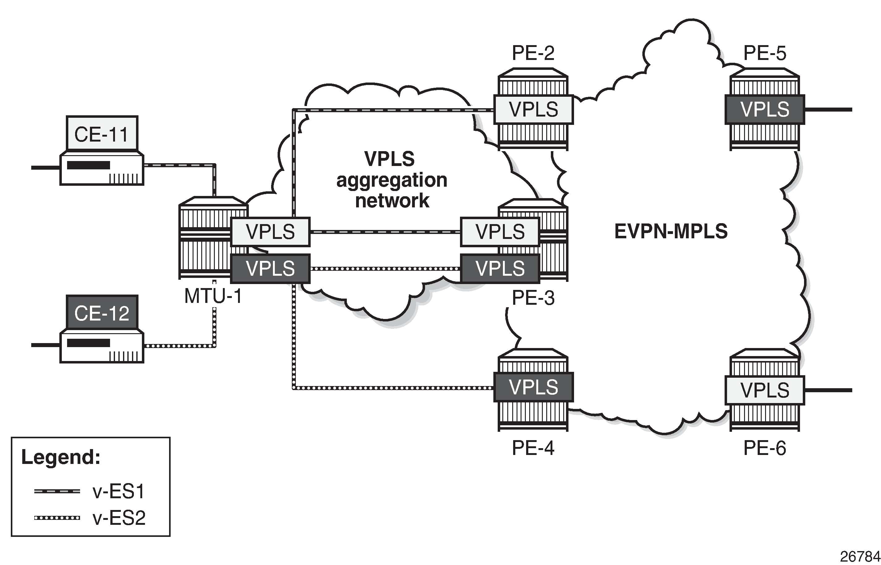 When a Layer 2 aggregation network is used to get access to EVPN, the association of ACs that belong to the same ES and physical ports or SDPs can be arbitrary. For example, the SDP between MTU-1 and PE-3 (vESs for PWs) cannot be associated with only one ES, because it is being used by two different CEs that require different ESs. The association must be at spoke-SDP level. The RFC 7432 port/lag-based ES definition is not sufficient, so vESs need to be defined. Virtual ESs can be configured with up to eight ranges of one or more: